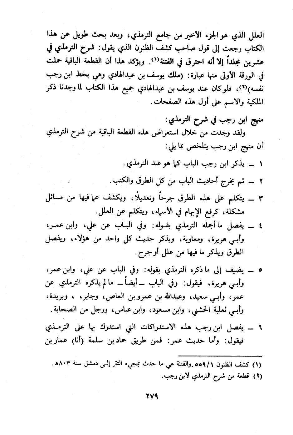 العلل الذي هو الجزء الأخير من جامع الترمذي، وبعد بحث طويل عن هذا الكتاب رجعت إلى قول صاحب كشف الظنون الذي يقول: شرح الترمذي في عشرين مجلدا إلا أنه احترق في الفتنة. ويؤكد هذا أن القطعة الباقية حملت في الورقة الأولى منها عبارة: (ملك يوسف بن عبد الهادي وهي بخط ابن رجب نفسه) ، فلو كان عند يوسف بن عبد الهادي جميع هذا الكتاب لما وجدنا ذكر الملكية والاسم على أول هذه الصفحات.