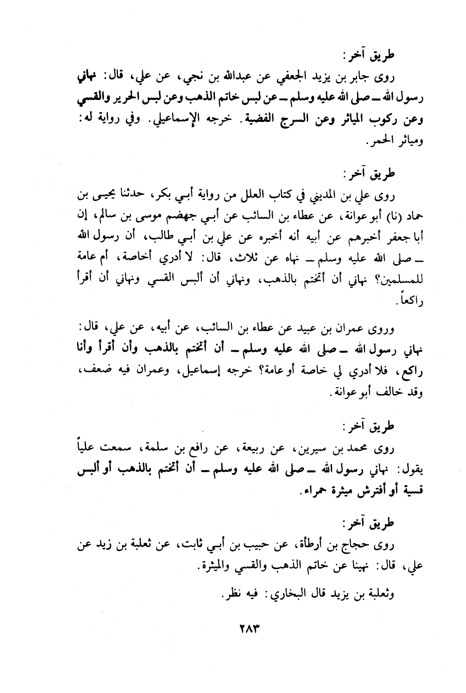 روى جابر بن يزيد الجعفي عن عبد الله بن نجي، عن علي، قال: نهاني رسول الله A عن لبس خاتم الذهب وعن لبس الحرير والقسي وعن ركوب المياثر وعن السرج الفضية. خرجه الإسماعيلي. وفي رواية له: ومياثر الحمر.