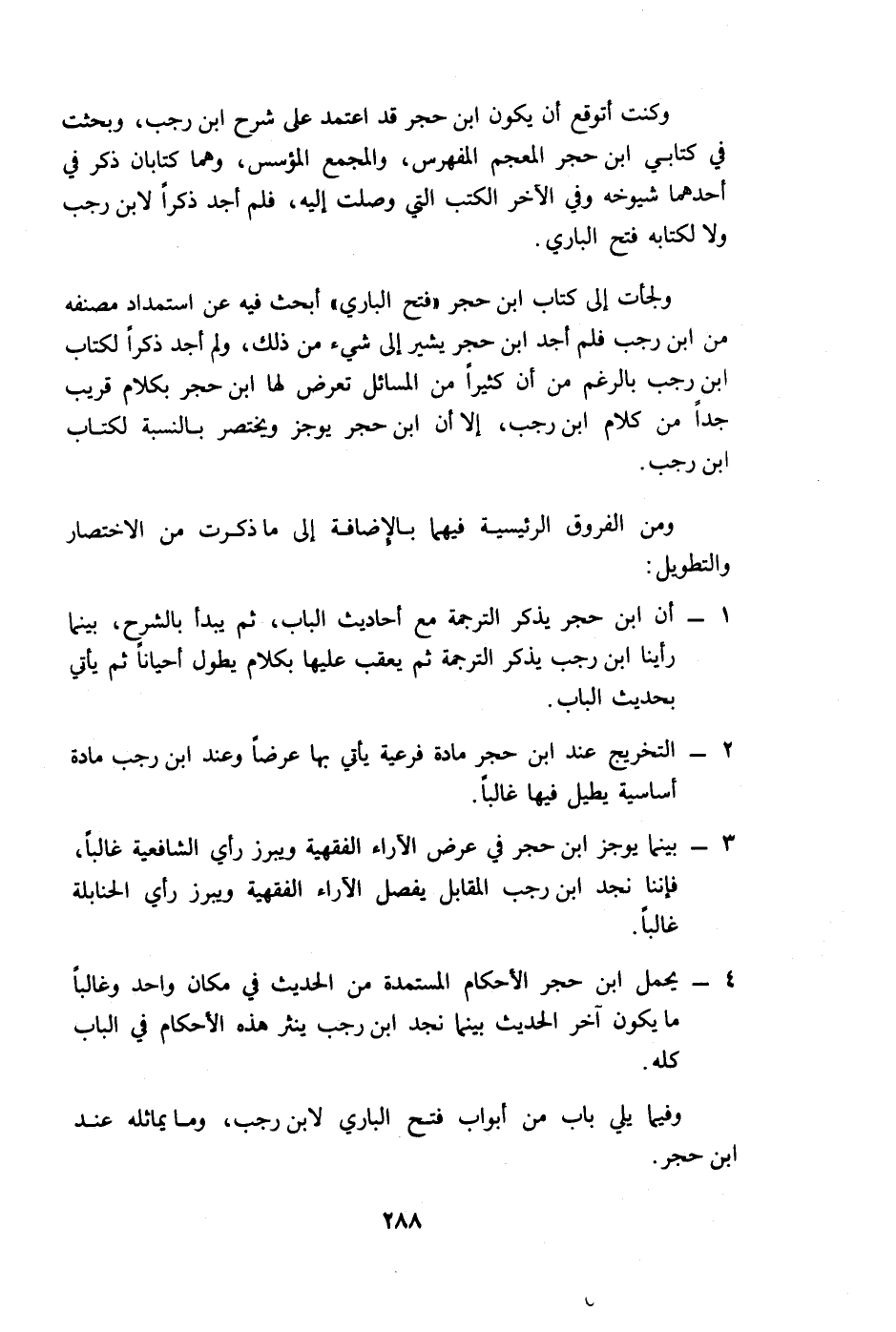 وكنت أتوقع أن يكون ابن حجر قد اعتمد على شرح ابن رجب، وبحثت في كتابي ابن حجر المعجم والمفهرس، والمجمع المؤسس، وهما كتابان ذكر في أحدهما شيوخه وفي الآخر الكتب التي وصلت إليه، فلم أجد ذكرا لابن رجب ولا لكتابه فتح الباري.