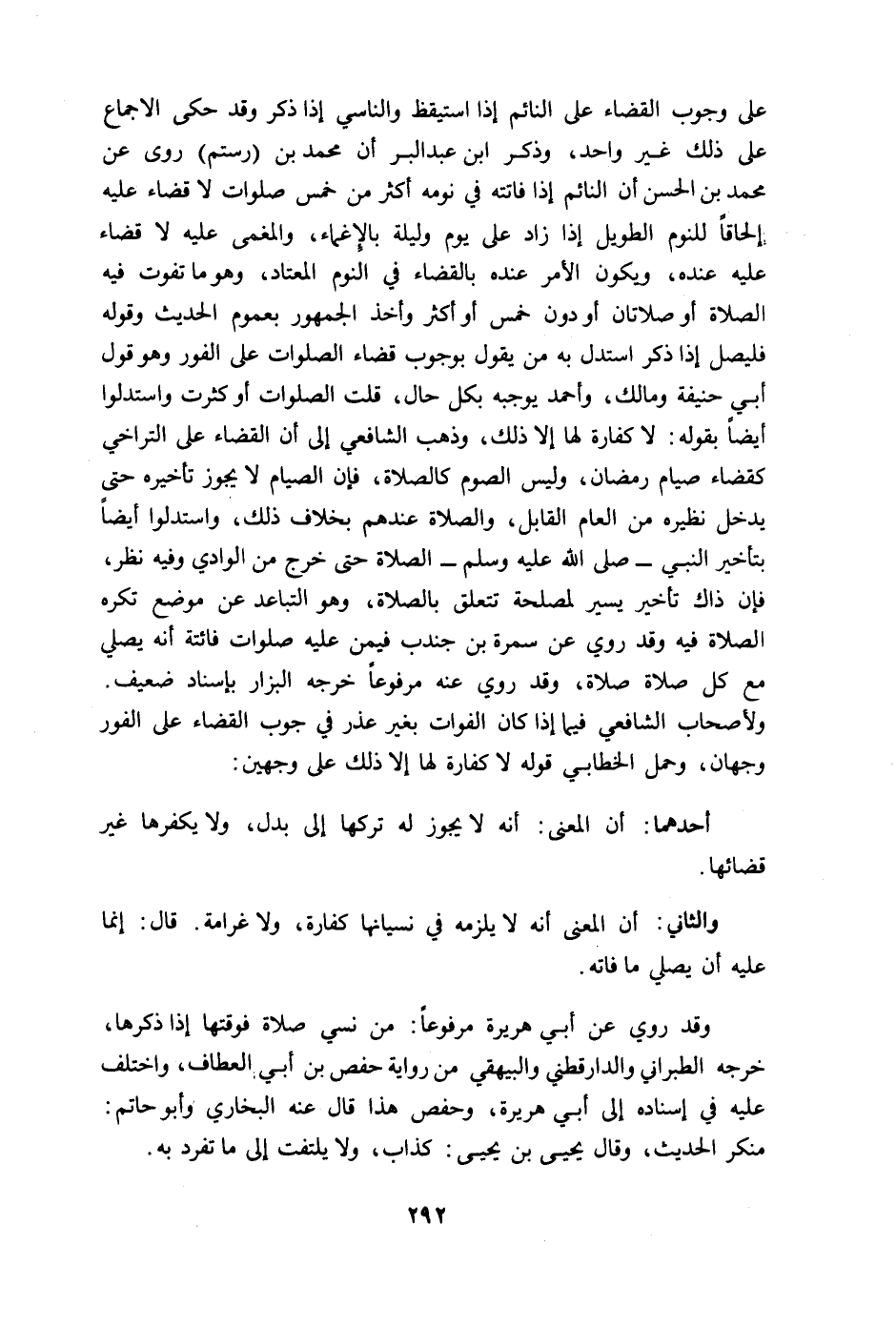 على وجوب القضاء على النائم إذا استيقظ والناسي إذا ذكر وقد حكى الإجماع على ذلك غير واحد، وذكر ابن عبد البر أن محمد بن (رسم) روى عن محمد بن الحسن أن النائم إذا فاتته في نومه أكثر من خمس صلوات لا قضاء عليه إلحاقا للنوم الطويل إذا زاد على يوم وليلة بالإغماء، والمغمى عليه لا قضاء عليه عنده، ويكون الأمر عنده بالقضاء في النوم المعتاد، وهو ما تفوت فيه الصلاة أو صلاتان أو دون خمس أو أكثر وأخذ الجمهور بعموم الحديث وقوله فليصل إذا ذكر استدل به من يقول بوجوب قضاء الصلوات على الفور وهو قول أبي حنيفة ومالك، وأحمد يوجبه بكل حال، قلت الصلوات أو كثرت واستدلوا أيضا بقوله: لا كفارة لها إلا ذلك، وذهب الشافعي إلى أن القضاء على التراخي كقضاء صيام رمضان، وليس الصوم كالصلاة، فإن الصيام لا يجوز تأخيره حتى يدخل نظيره من العام القابل، والصلاة عندهم بخلاف ذلك، واستدلوا أيضا بتأخير النبي A الصلاة حتى خرج من الوادي وفيه نظر، فإن ذاك تأخير يسير لمصلحة تتعلق بالصلاة، وهو التباعد عن موضع تكره الصلاة فيه وقد روي عن سمرة بن جندب فيمن عليه صلوات فائتة أنه يصلي مع كل صلاة صلاة، وقد روي عنه مرفوعا خرجه البزار بإسناده ضعيف. ولأصحاب الشافعي فيما إذا كان الفوات بغير عذر في جوب القضاء على الفور وجهان، وحمل الخطابي قوله لا كفارة لها إلا ذلك على وجهين: