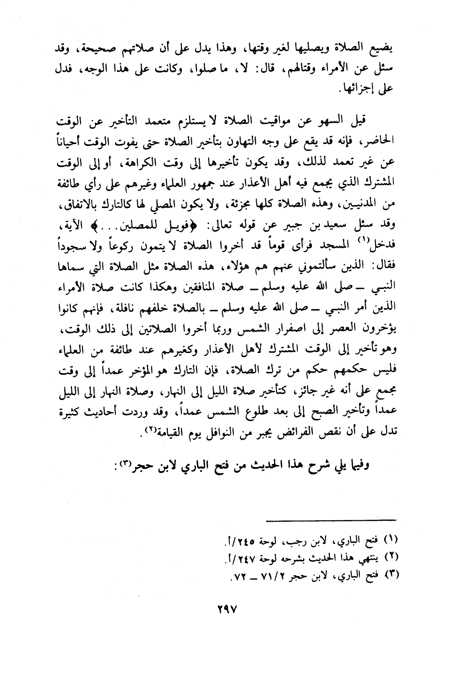 قيل السهو عن مواقيت الصلاة لا يستلزم متعمد التأخير عن الوقت الحاضر، فإنه قد يقع على وجه التهاون بتأخير الصلاة حتى يفوت الوقت أحيانا عن غير تعمد لذلك، وقد يكون تأخيرها إلى وقت الكراهة، أو إلى الوقت المشترك الذي يجمع فيه أهل الأعذار عند جمهور العلماء وغيرهم على رأي طائفة من المدنيين، وهذه الصلاة كلها مجزئة، ولا يكون المصلي لها كالتارك بالاتفاق، وقد سئل سعيد بن جبير عن قوله تعالى: (فويل للمصلين ... ) الآية، فدخل المسجد فرأى قوما قد أخروا الصلاة لا يتمون ركوعا ولا سجودا فقال: الذين سألتموني عنهم هم هؤلاء، هذه الصلاة مثل الصلاة التي سماها النبي A صلاة المنافقين وهكذا كانت صلاة الأمراء الذين أمر النبي A بالصلاة خلفهم نافلة، فإنهم كانوا يؤخرون العصر إلى اصفرار الشمس وربما أخروا الصلاتين إلى ذلك الوقت، وهو تأخير إلى الوقت المشترك لأهل الأعذار وكغيرهم عند طائفة من العلماء فليس حكمهم حكم من ترك الصلاة، فإن التارك هو المؤخر عمدا إلى وقت مجمع على أنه غير جائز، كتأخير صلاة الليل إلى النهار، وصلاة النهار إلى الليل عمدا وتأخير الصبح إلى بعد طلوع الشمس عمدا، وقد وردت أحاديث كثيرة تدل على أن نقص الفرائض يجبر من النوافل يوم القيامة.