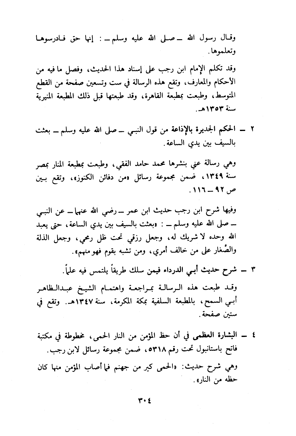 وفيها شرح ابن رجب حديث ابن عمر - Bهما - عن النبي A: "بعثت بالسيف بين يدي الساعة، حتى يعبد الله وحده لا شريك له، وجعل رزقي تحت ظل رمحي، وجعل الذلة والصغار على من خالف أمري، ومن تشبه بقوم فهو منهم".