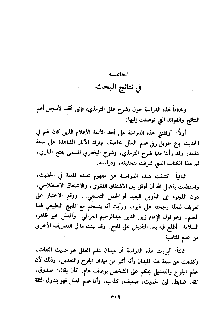 ثانيا: كشف هذه الدراسة عن مفهوم محدد للعلة في الحديث، واستطعت بفضل الله أن أوفق بين الاشتقاق اللغوي، والاشتقاق الاصطلاحي، دون اللجوء إلى التأويل البعيد أو الحمل التعسفي.. ووقع الاختيار على تعريف للعلة رجحته على غيره، ورأيت أنه ينسجم مع المنهج التطبيقي لهذا العلم، وهو قول الإمام زين الدين عبد الرحمن العراقي: والمعلل خبر ظاهره السلامة أطلع فيه بعد التفتيش على قادح. وقد بينت ما في التعاريف الأخرى من عدم المناسبة.