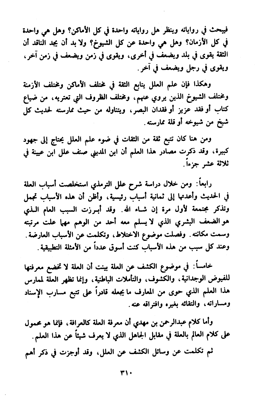 رابعا: ومن خلال دراسة شرح علل الترمذي استخلصت أسباب العلة في الحديث وأعدتها إلى ثمانية أسباب رئيسية، وأظن أن هذه الأسباب تجمل وتذكر مجتمعة لأول مرة إن شاء الله. وقد أبرزت السبب العام الذي هو الضعف البشري الذي لا يسلم معه أحد من الوهم مهما علت مرتبته وسمت مكانته. وفصلت موضوع الاختلاط، وتكلمت عن الأسباب العارضة. وعند كل سبب من هذه الأسباب كنت أسوق عددا من الأمثلة التطبيقية.