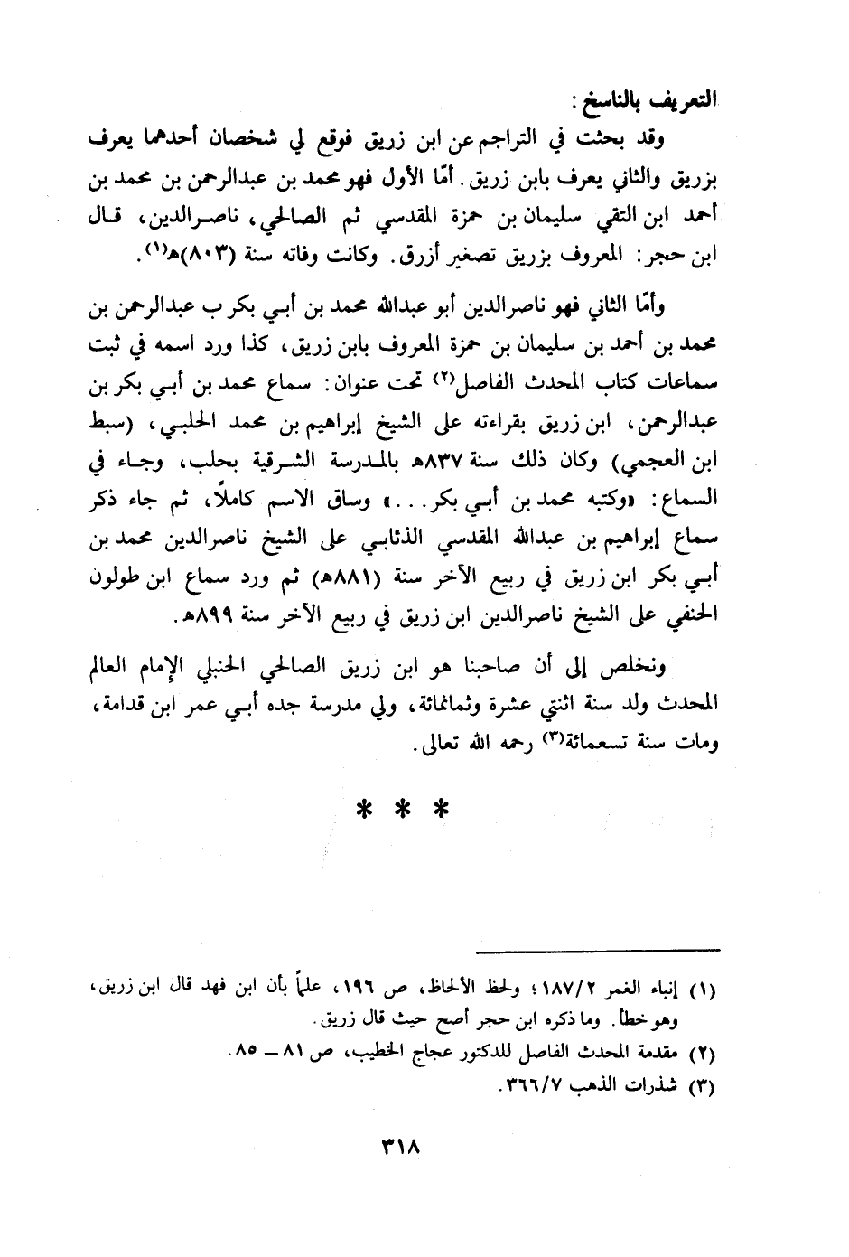ونخلص إلى أن صاحبنا هو ابن زريق الصالحي الحنبلي الإمام العالم المحدث ولد سنة اثنتي عشرة وثمانمائة، ولي مدرسة جده أبي عمر ابن قدامة، ومات سنة تسعمائة