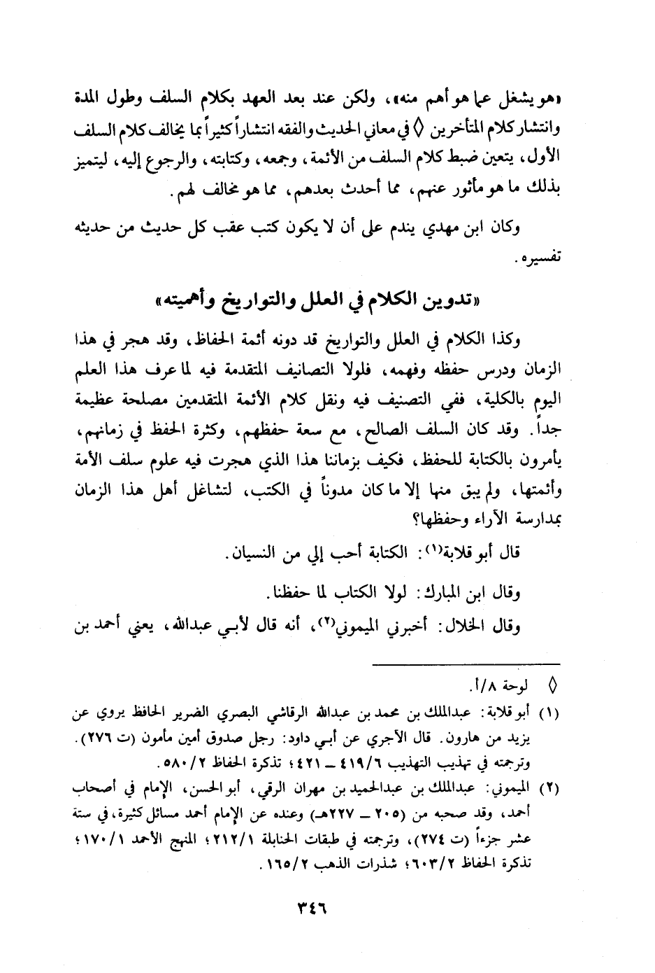 وكذا الكلام في العلل والتواريخ قد دون أئمة الحفاظ، وقد هجر في هذا الزمان ودرس حفظه وفهمه، فلولا التصانيف المتقدمة فيه لما عرف هذا العلم اليوم بالكلية، ففي التصنيف فيه ونقل كلام الأئمة المتقدمين مصلحة عظيمة جدا. وقد كان السلف الصالح، ومع سعة حفظهم، وكثرة الحفظ في زمانهم، يأمرون بالكتابة للحفظ، فكيف بزماننا هذا الذي هجرت فيه علوم سلف الأمة وأئمتها، ولم يبق منها إلا ما كان مدونا في الكتب، لتشاغل أهل هذا الزمان بمدارسة الآراء وحفظها؟