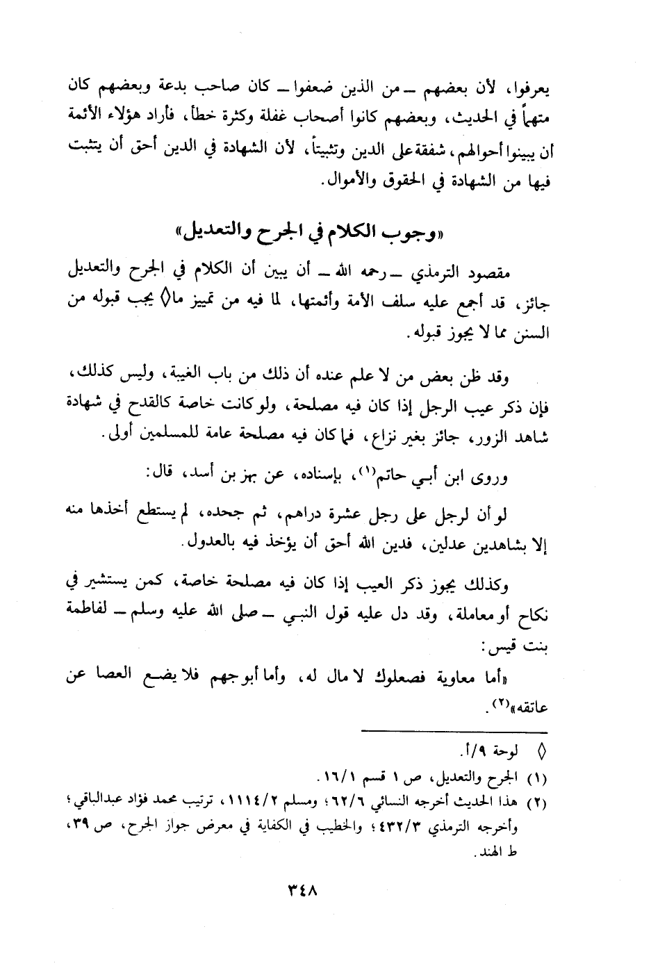 مقصود الترمذي - C - أن يبين أن الكلام في الجرح والتعديل جائز، قد أجمع عليه سلف الأمة وأئمتها، لما فيه من تمييز ما يجب قبوله من السنن مما لا يجوز قبوله.