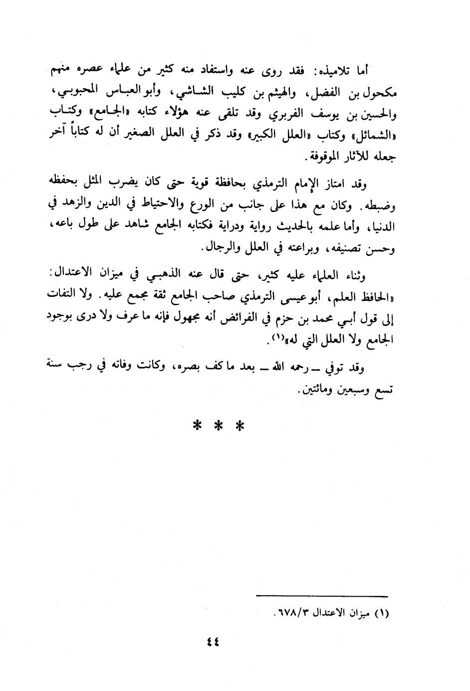 وثناء العلماء عليه كثير، حتى قال عنه الذهبي في ميزان الاعتدال: "الحافظ العلم، أبو عيسى الترمذي صاحب الجامع ثقة مجمع عليه. ولا التفات إلى قول أبي محمد بن حزم في الفرائض انه مجهول فإنه ما عرف ولا درى بوجود الجامع ولا العلل التي له".