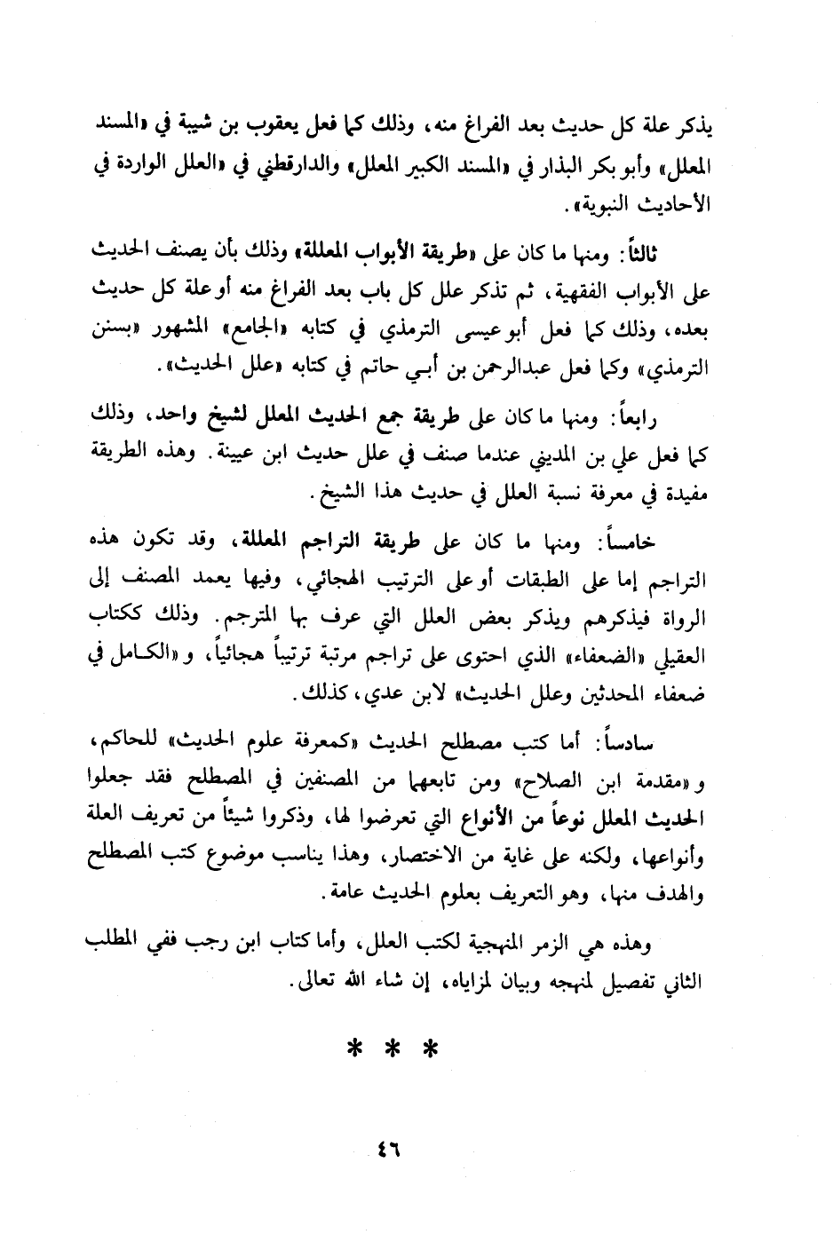 سادسا: أما كتب مصطلح الحديث "كمعرفة علوم الحديث" للحاكم، و"مقدمة ابن الصلاح" ومن تابعهما من المصنفين في المصطلح فقد جعلوا الحديث المعلل نوعا من الأنواع التي تعرضوا لها، وذكروا شيئا من تعريف العلة وأنواعها، ولكنه على غاية من الاختصار، وهذا يناسب موضوع كتب المصطلح والهدف منها، وهو التعريف بعلوم الحديث عامة.