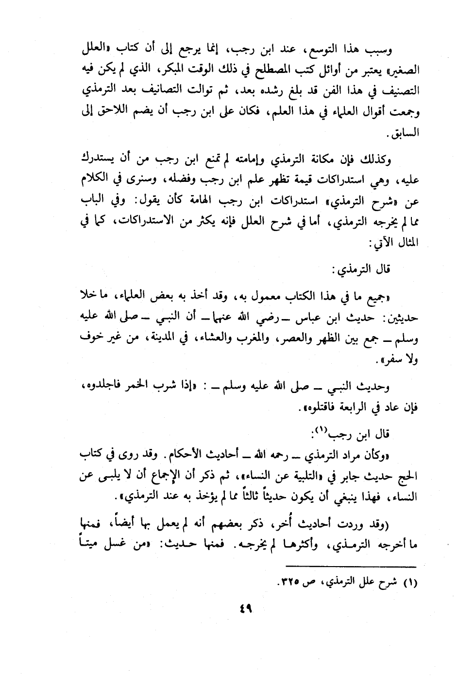 وسبب هذا التوسع، عند ابن رجب، إنما يرجع إلى أن كتاب "العلل الصغير" يعتبر من أوائل كتب المصطلح في ذلك الوقت المبكر، الذي لم يكن فيه التصنيف في هذا الفن قد بلغ رشده بعد، ثم توالت التصانيف بعد الترمذي وجمعت أقوال العلماء في هذا العلم، فكان على ابن رجب أن يضم اللاحق إلى السابق.