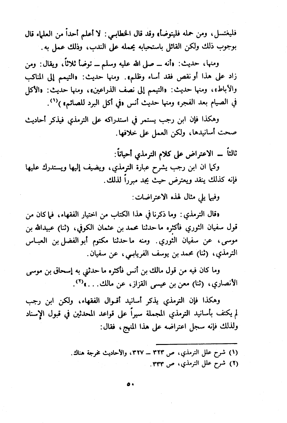 وهكذا فإن الترمذي يذكر أسانيد أقوال الفقهاء، ولكن ابن رجب لم يكتف بأسانيد الترمذي المجملة سيرا على قواعد المحدثين في قبول الإسناد ولذلك فإنه سجل اعتراضه على هذا المنهج، فقال:
