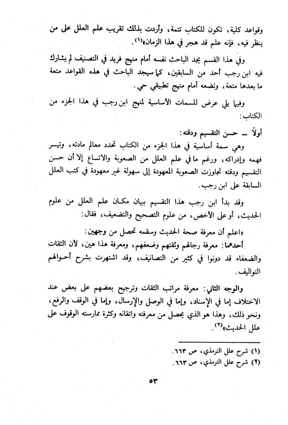 وهي سمة أساسية في هذا الجزء من الكتاب تحدد معالم مادته، وتيسر فهمه وإدراكه، ورغم ما في علم العلل من الصعوبة والاتساع إلا أن حسن التقسيم ودقته تجاوزت الصعوبة المعهودة إلى سهولة غير معهودة في كتب العلل السابقة على ابن رجب.