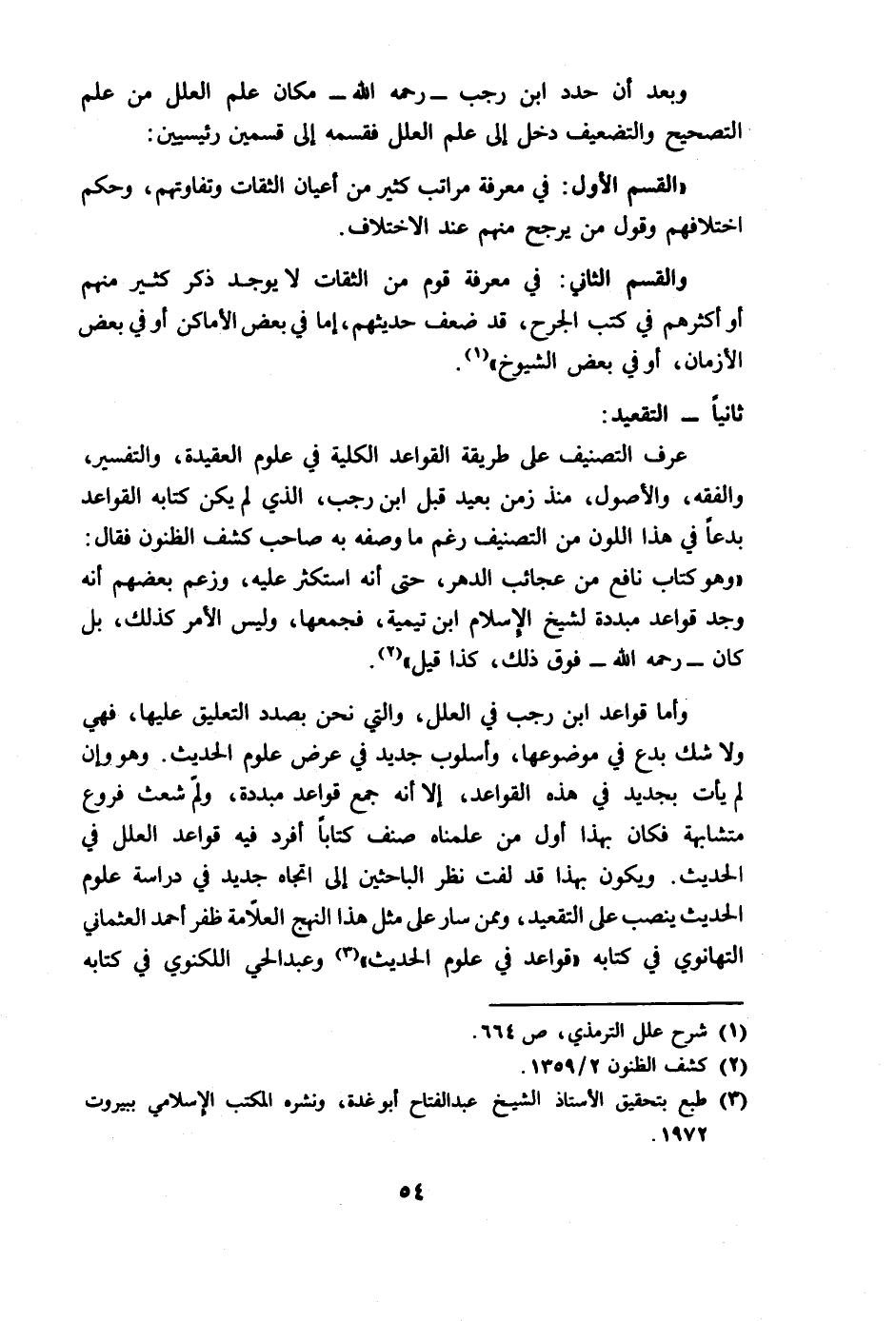 وأما قواعد ابن رجب في العلل، والتي نحن بصدد التعليق عليها، فهي ولا شك بدع في موضوعها، وأسلوب جديد في عرض علوم الحديث. وهو وإن لم يأتي بجديد في هذه القواعد إلا أنه جمع قواعد مبددة، ولم شعث فروع متشابهه فكان بهذا أول من علمناه صنف كتابا أفرد فيه قواعد العلل في الحديث. ويكون بهذا قد لفت نظر الباحثين إلى اتجاه جديد في دراسة علوم الحديث ينصب على التقعيد، وممن سار على مثل هذا النهج العلامة ظفر أحمد العثماني التهانوي في كتابه "قواعد في علوم الحديث" وعبد الحي اللكنوي في كتابه