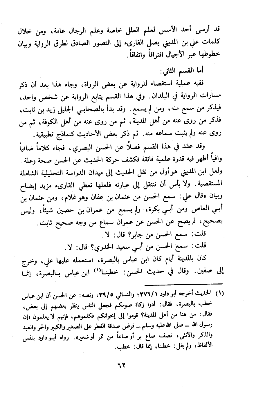 وقد عقد في هذا القسم فصلا عن الحسن البصري، فجاء كلاما ضافيا وافيا أظهر فيه قدرة علمية فائقة فكشف حركة الحديث عن الحسن صحة وعلة. ولعل ابن المديني هو أول من نقل الحديث إلى ميدان الدراسة التحليلية الشاملة المستقصية. ولا بأس أن ننتقل إلى عبارته فلعلها تعطي القارئ مزيد إيضاح وبيان "قال علي: سمع الحسن من عثمان بن عفان وهو غلام، ومن عثمان بن أبي العاص ومن أبي بكر، ولم يسمع من عمران بن حصين شيئا، وليس بصحيح، لم يصح عن الحسن عن عمران سماع من وجه صحيح ثابت.