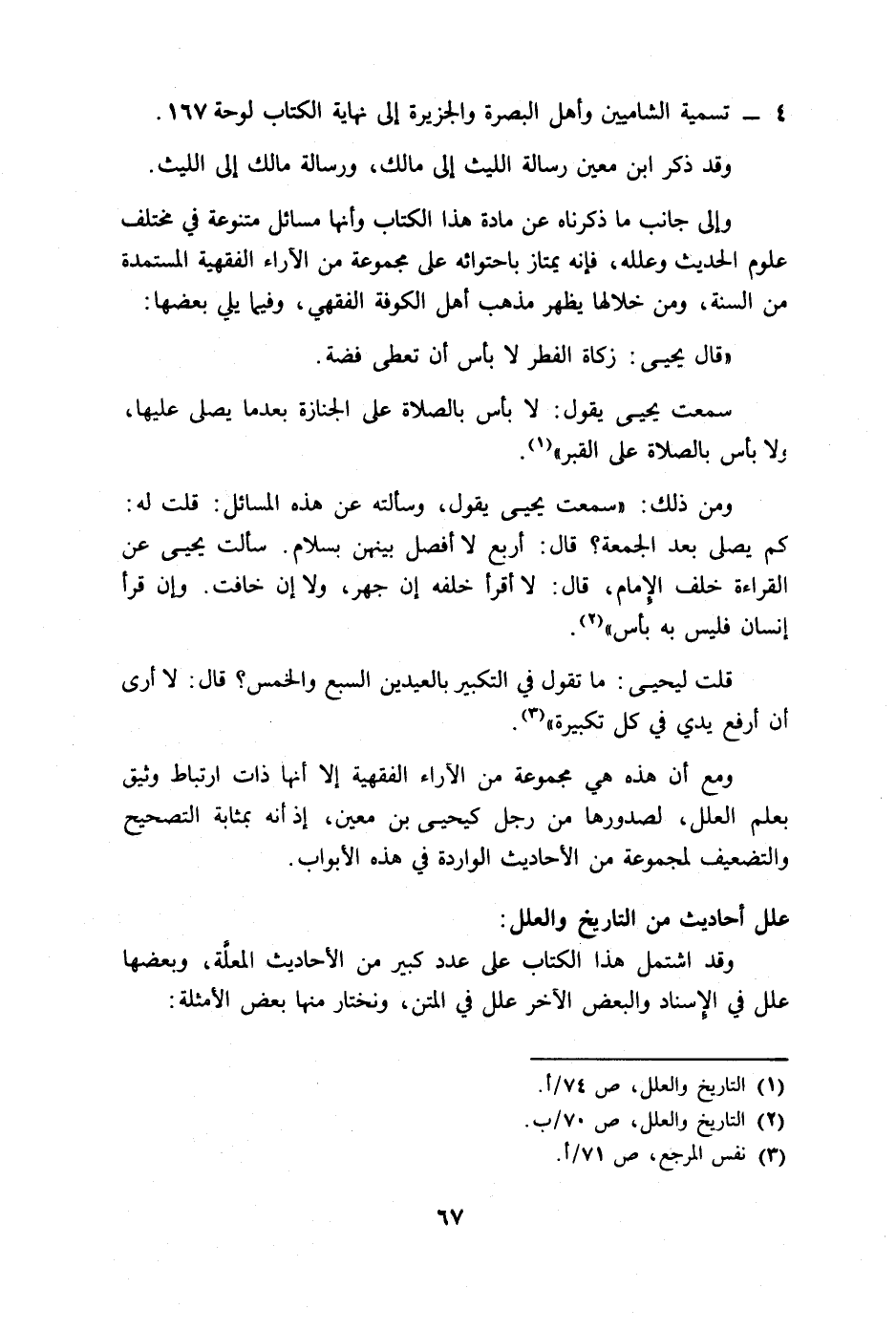 ومع أن هذه هي مجموعة من الآراء الفقهية إلا أنها ذات ارتباط وثيق بعلم العلل، لصدورها من رجل كيحيى بن معين، إذ أنه بمثابة التصحيح والتضعيف لمجموعة من الأحاديث الواردة في هذه الأبواب.