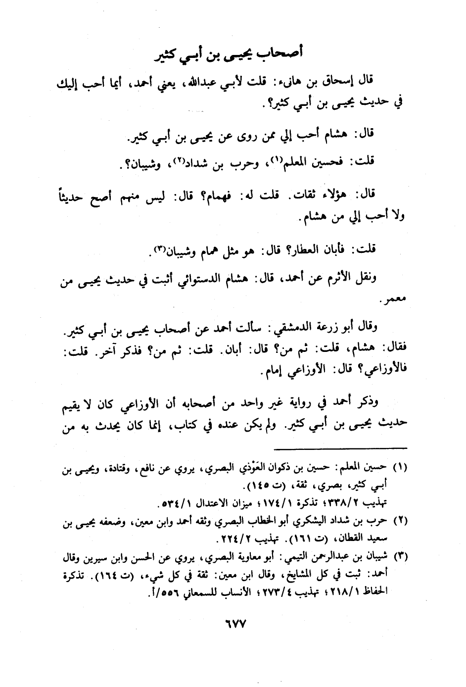 وقال الأثرم ـ أيضاً ـ: قال أبو عبد الله: ما أحسن حديث الكوفيين عن هشام بن عروة، أسندوا عنه أشياء. قال: وما أرى ذاك إلا على النشاط، يعني أن هشاماً ينشط تارة فيسند، ثم يرسل مرة أخرى.
