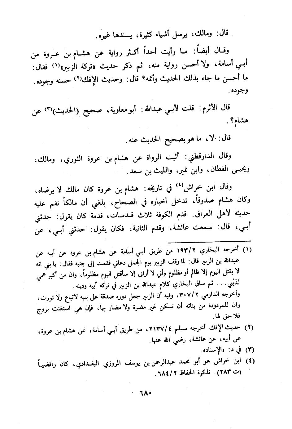 قال: ورأيت في كتاب علي بن المديني، قال: قال يحيى بن سعيد: رأيت مالك بن أنس في النوم فسألته عن هشام بن عروة، فقال: أما ما حدث به وهو عندنا فهو، أي كأنه صححه، وما حدث به بعدما خرج من عندنا فكأنه يوهنه.