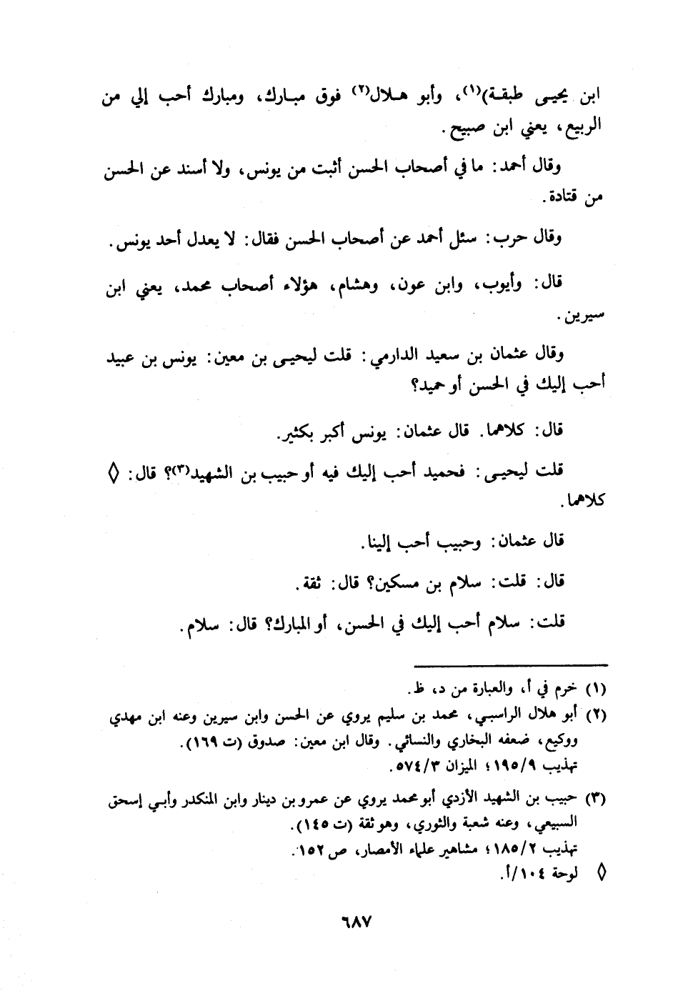 وقال عثمان الدارمي: قلت ليحيى: هشام أحب إليك في ابن سيرين، أو يزيد بن إبراهيم؟ قال: كلاهما ثبتان.