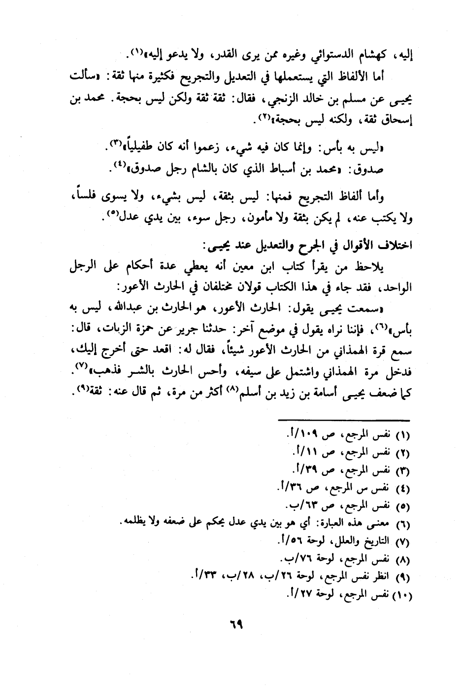 "سمعت يحيى يقول: الحارث الأعور، هو الحارث بن عبد الله، ليس به بأس"، فإننا نراه يقول في موضع آخر: حدثنا جرير عن حمزة الزيات، قال: سمع قرة الهمذاني من الحارث الأعور شيئا، فقال له: اقعد حتى أخرج إليك، فدخل مرة الهمذاني واشتمل على سيفه، وأحس الحارث بالشر فذهب". كما ضعف يحيى أسامة بن زيد بن أسلم أكثر من مرة، ثم قال عنه: ثقة.