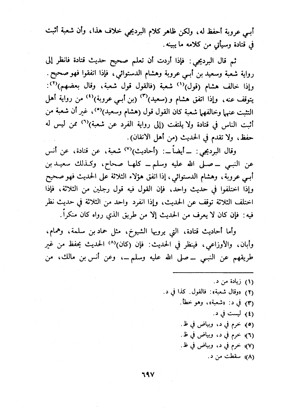 ونقل الأثرم عن أحمد، قال: عمرو بن الحارث روى عن قتادة (مناكير، وقال) في جرير بن حازم: كان يحدث بالتوهم أشياء عن قتادة (يسندها بواطيل) ، وكذلك ضعف يحيى وغيره حديث جرير عن قتادة (خاصة وسليمان التيمي.