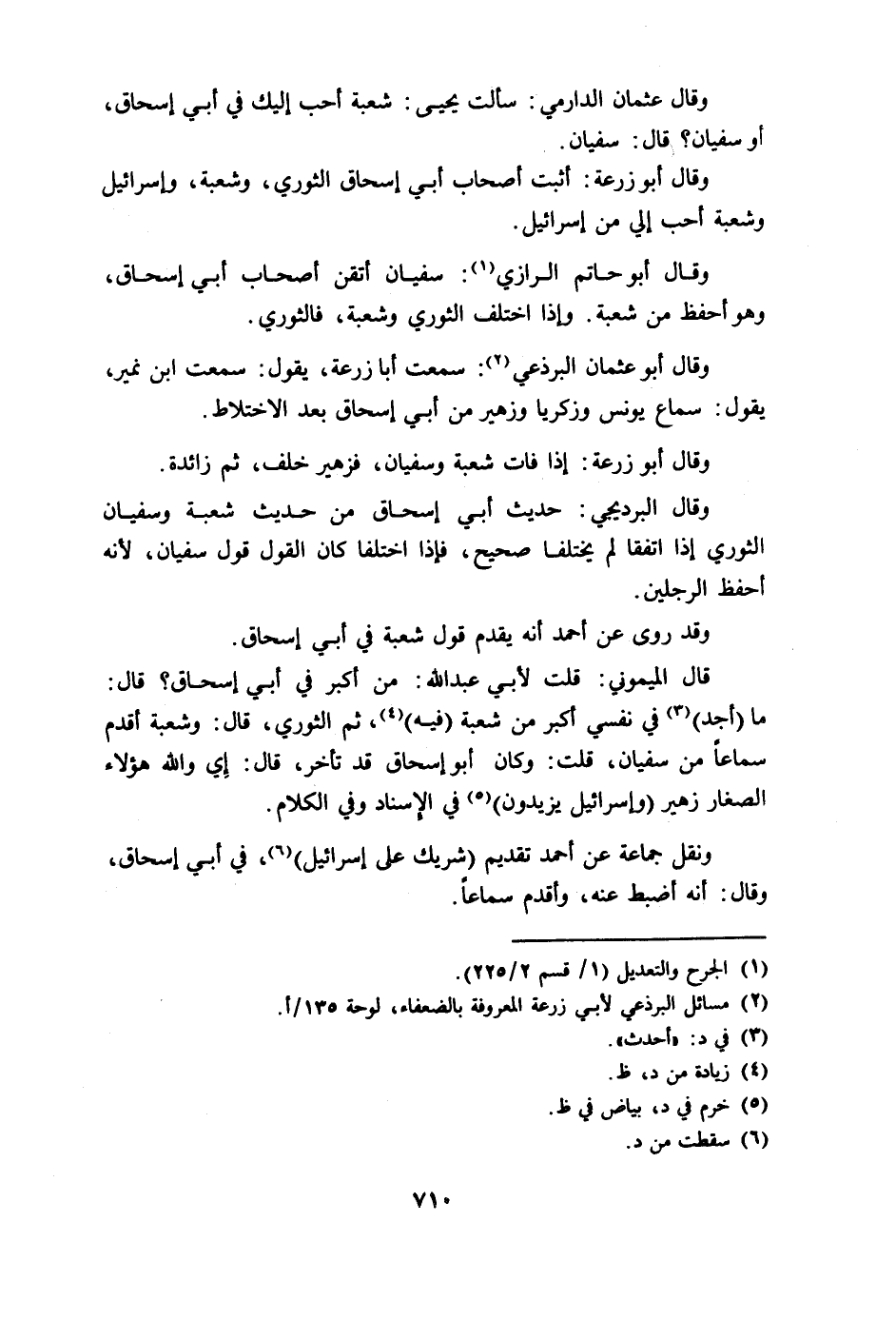 وقد رجحت طائفة إسرائيل في أبي إسحاق وخاصة على الثوري وشعبة، منهم: ابن مهدي، (وروي عن شعبة) أنه كان يقول في أحاديث أبي إسحاق سلوا عنها (إسرائيل، فإنه) أثبت فيها مني.