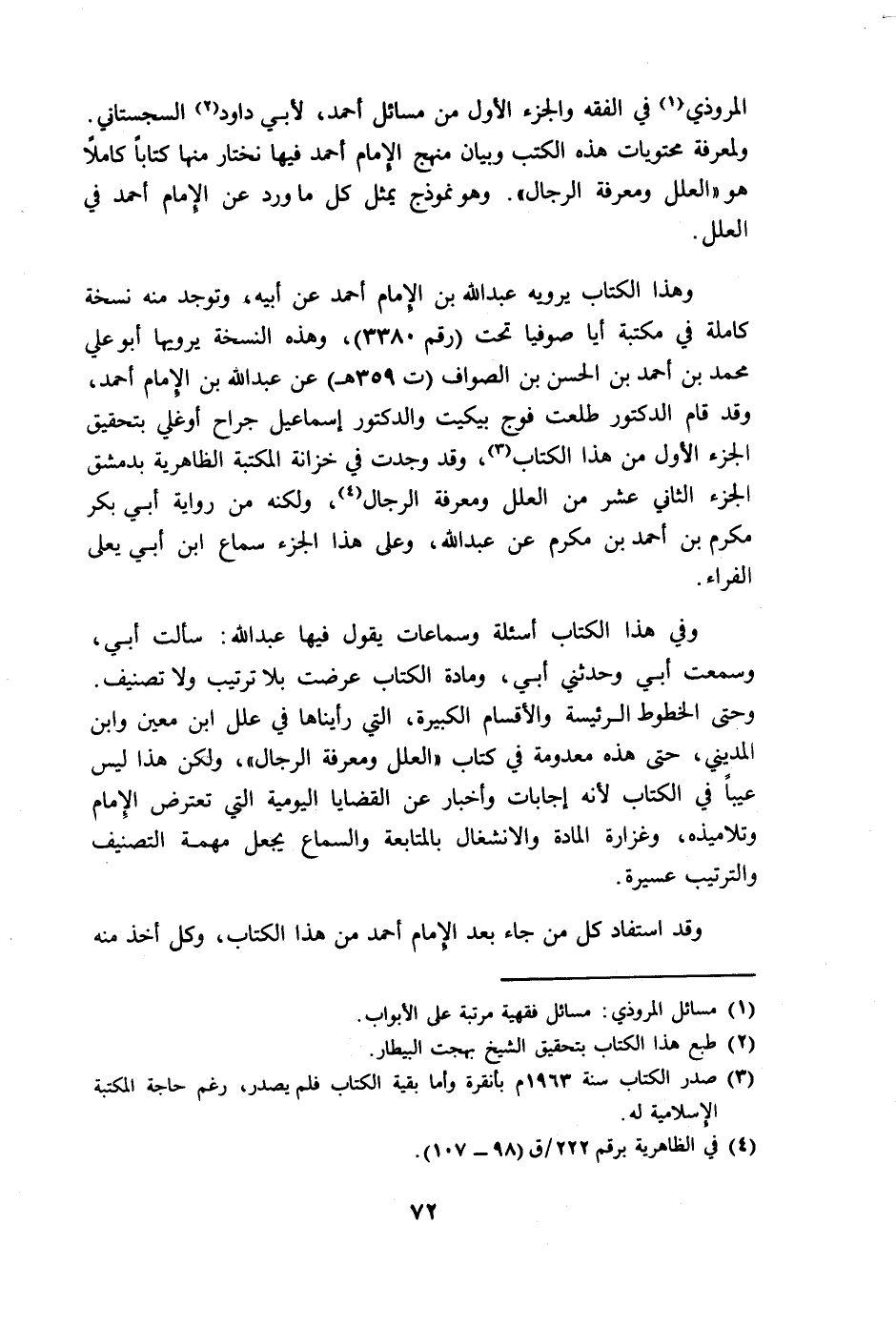 المروذي في الفقه والجزء الأول من مسائل أحمد، لأبي داود السجستاني. ولمعرفة محتويات هذه الكتب وبيان منهج الإمام أحمد فيها نختار منها كتابا كاملا هو "العلل ومعرفة الرجال". وهو نموذج يمثل كل ما ورد عن الإمام أحمد في العلل.