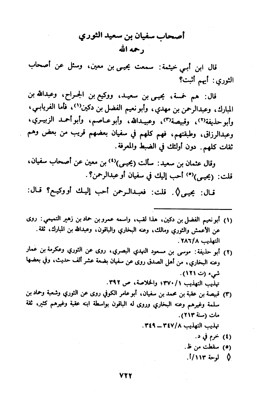 وذكر صالح بن أحمد بن حنبل عن أبيه قال: (عبد الرحمن) ، بن مهدي أقل سقطاً من وكيع في سفيان، قد خالفه وكيع في ستين حديثاً من حديث سفيان، وكان عبد الرحمن يجيء بها على ألفاظها، قيل له: فأبو نعيم؟ قال: أين يقع أبو نعيم من هؤلاء؟.