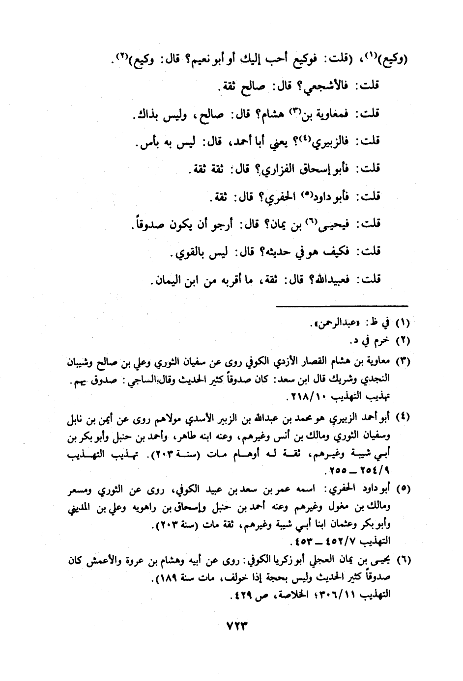 وقال ابن أبي حاتم: قيل لأبي: قال يحيى بن معين: وكيع أحب إلي في سفيان من ابن مهدي، فأيهما أحب إليك، قال: عبد الرحمن ثبت، ووكيع ثقة.