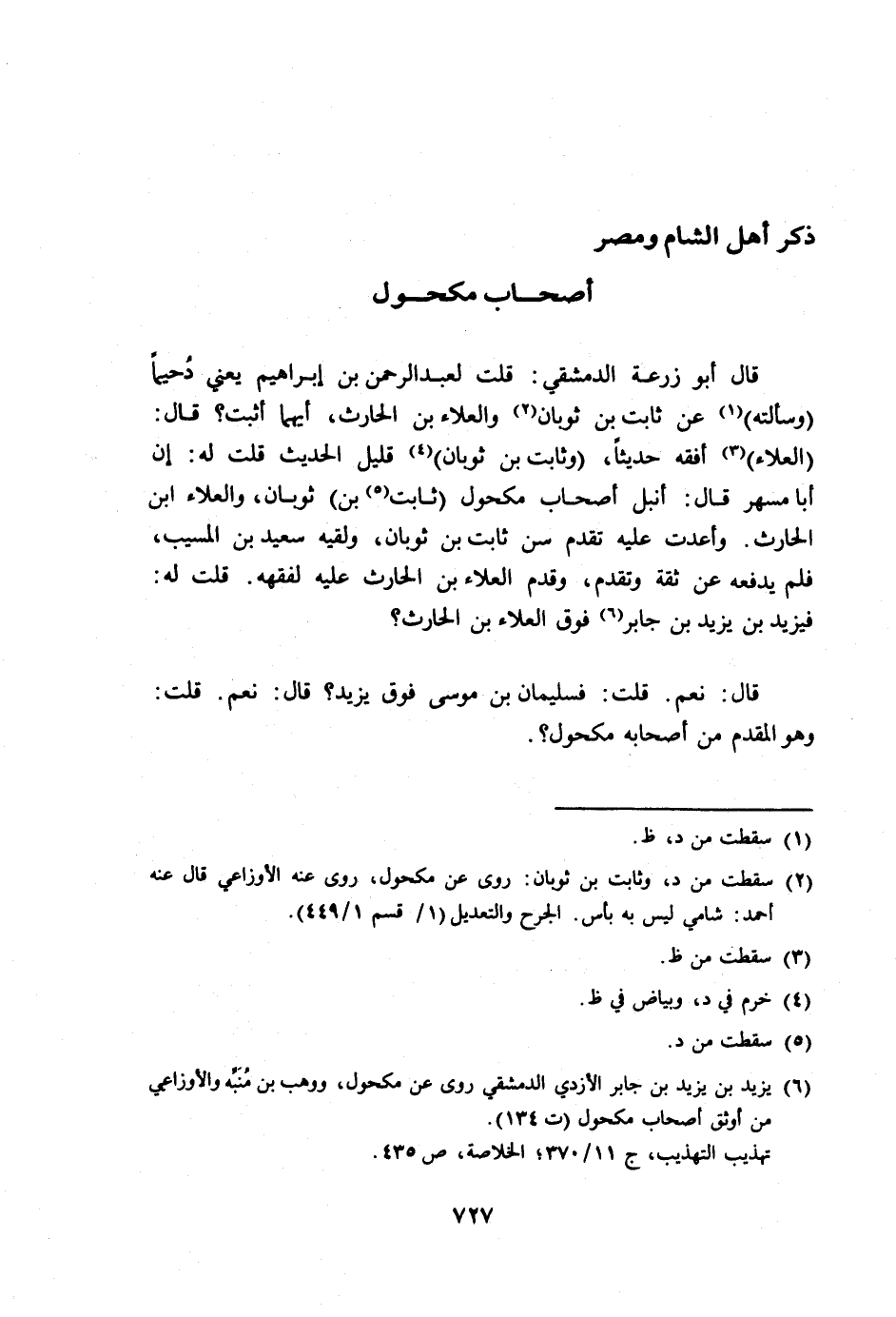 مكحول (ثلاثة) : سليمان بن موسى، ويزيد بن يزيد بن جابر، والعلاء بن الحارث. و (ثنا) أبو مسهر، أن سعيد بن عبد العزيز حدثه أن كتاب مكحول في الحج أخذه من العلاء بن الحارث، وذكر أبو زرعة أسماء جماعة من الرواة، عن مكحول، سأل عنهم، منهم محمد بن راشد، الذي يقال له: المكحولي، وذكر أنه سأل دحيماً عنه، فقال: ثقة، وكان (يميل) إلى هوى، وقدم سعيد ابن بشير عليه، وقال أبو زرعة: أعلم أهل دمشق بحديث مكحول، وأجمعه لأصحابه، الهيثم بن حميد، ويحيى بن حمزة.