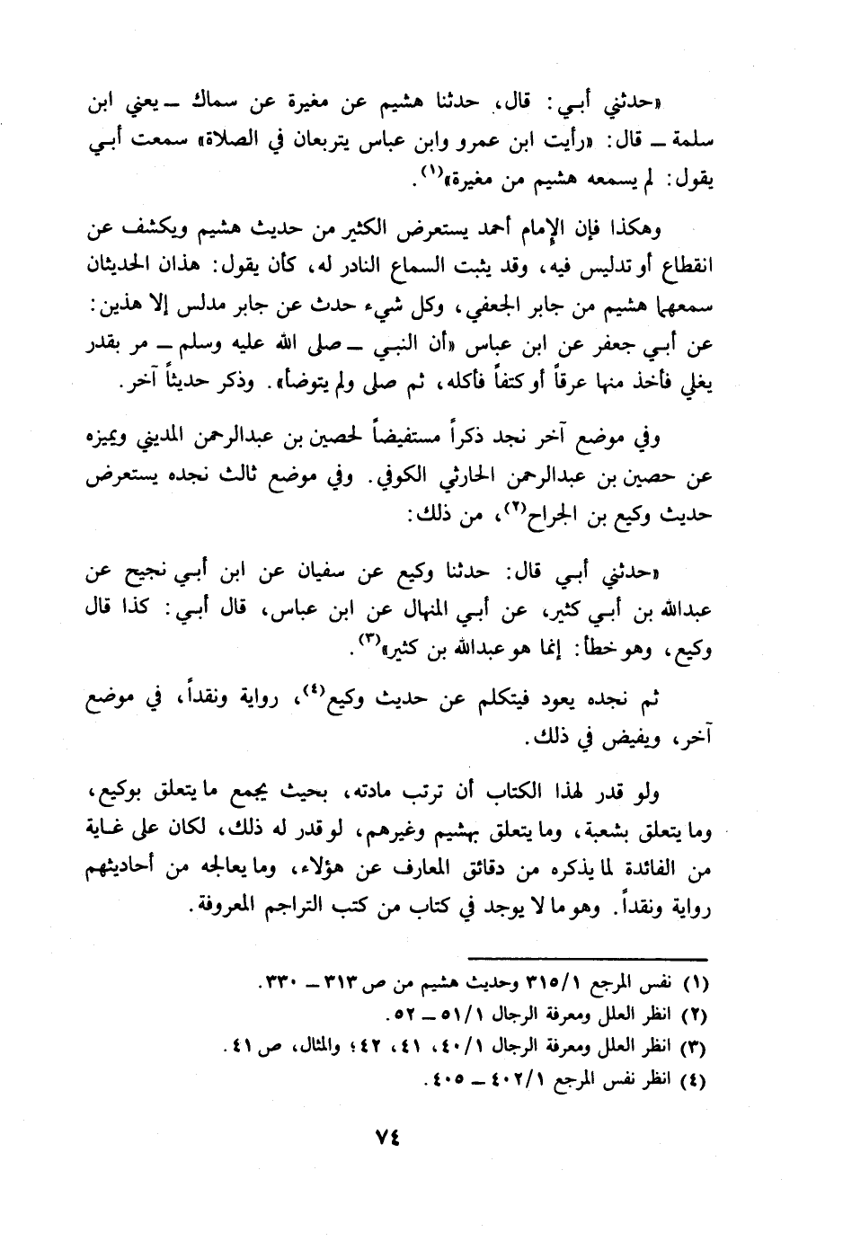 وفي موضع آخر نجد ذكرا مستفيضا لحصين بن عبد الرحمن المديني ويميزه عن حصين بن عبد الرحمن الحارثي الكوفي. وفي موضع ثالث نجده يستعرض حديث وكيع بن الجراح، من ذلك: