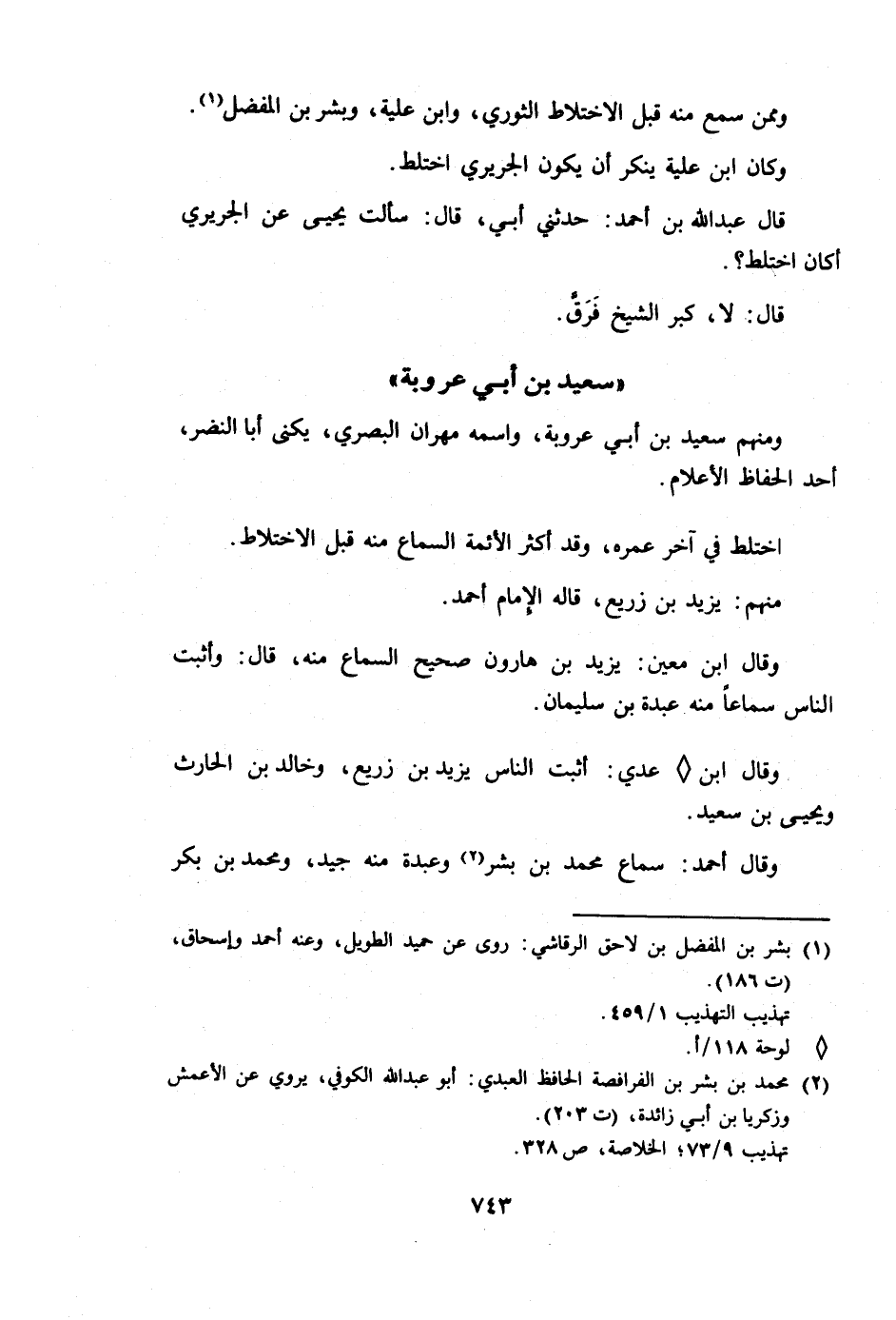 وقال العجلي: روى عن ابن أبي عروبة في الاختلاط يزيد بن هارون وابن المبارك وابن عدي، كلما روى عنه مثل هؤلاء الصغار فهو مختلط، إنما الصحيح حديث حماد بن سلمة، وابن علية، وعبد الأعلى عنه، والثوري وشعبة صحيح.