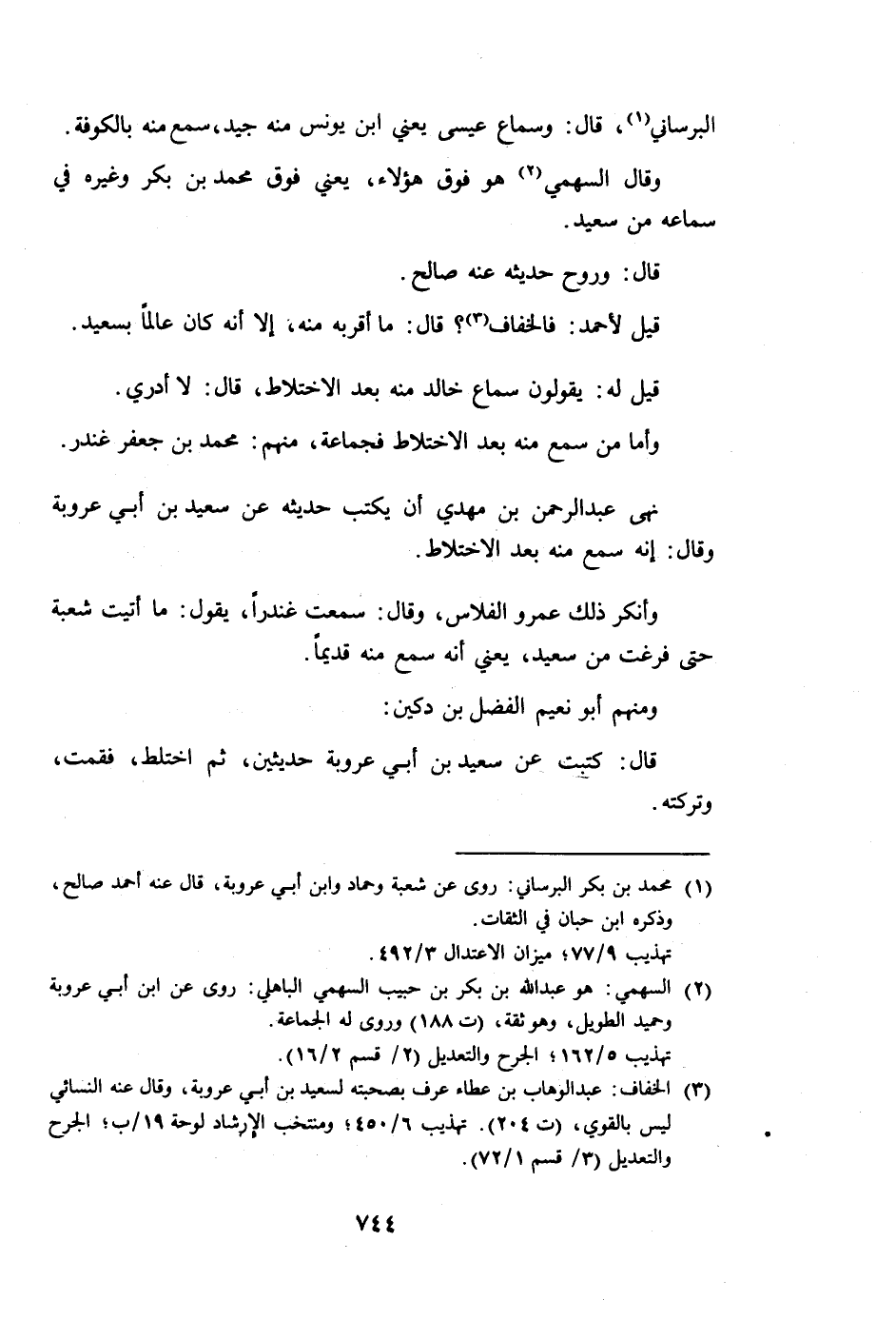 أو أسباط بن محمد؟ قال: أسباط أحب إلي، لأنه سمع بالكوفة. قلت: أيما أحب إليك الخفاف، أو أبو قطن، في سعيد؟ قال: الخفاف أقدم سماعاً من أبي قطن.
