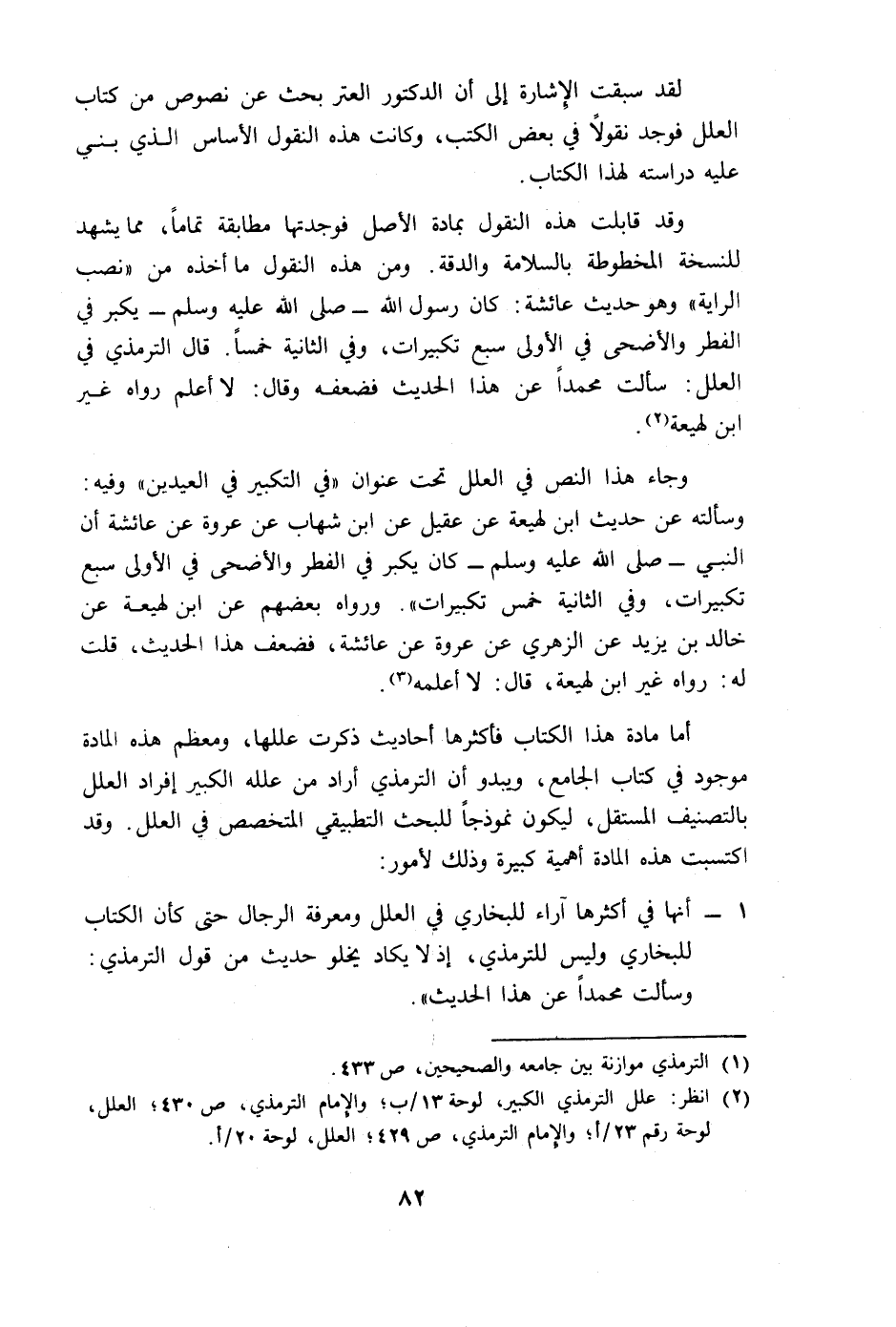 وقد قابلت هذه النقول بمادة الأصل فوجدتها مطابقة تماما، مما يشهد للنسخة المخطوطة بالسلامة والدقة. ومن هذه النقول ما أخذه من "نصب الراية" وهو حديث عائشة: كان رسول الله A يكبر في الفطر والأضحى في الأولى سبع تكبيرات، وفي الثانية خمسا. قال الترمذي في العلل: سألت محمدا عن هذا الحديث فضعفه وقال: لا أعلم رواه غير ابن لهيعة.