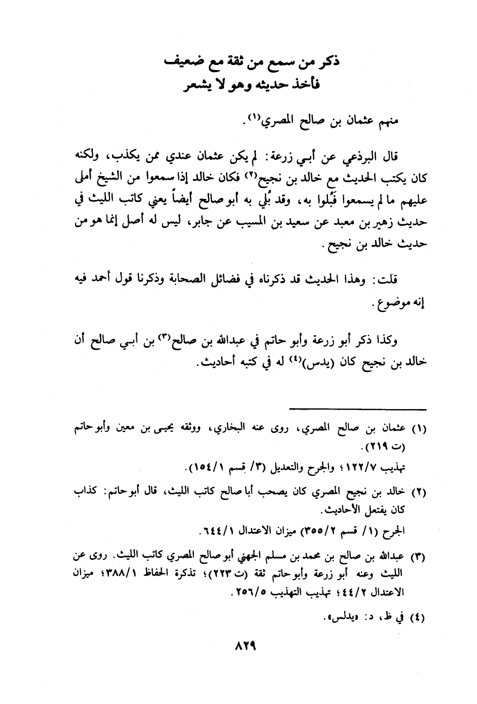 تنبيه: اعلم أنه قد يخرج في الصحيح لبعض من تكلم فيه، إما متابعة واستشهاداً وذلك معلوم. وقد يخرج من حديث بعضهم ما هو معروف عن شيوخه من طرق أخرى، ولكن لم يكن وقع لصاحب الصحيح ذلك الحديث إلا من طريقه، إما مطلقاً أو بعلو، فإذا كان الحديث معروفاً عن الأعمش صحيحاً عنه، ولم يقع لصاحب الصحيح عنه بعلو، إلا من طريق بعض من تكلم فيه من أصحابه خرجه عنه.