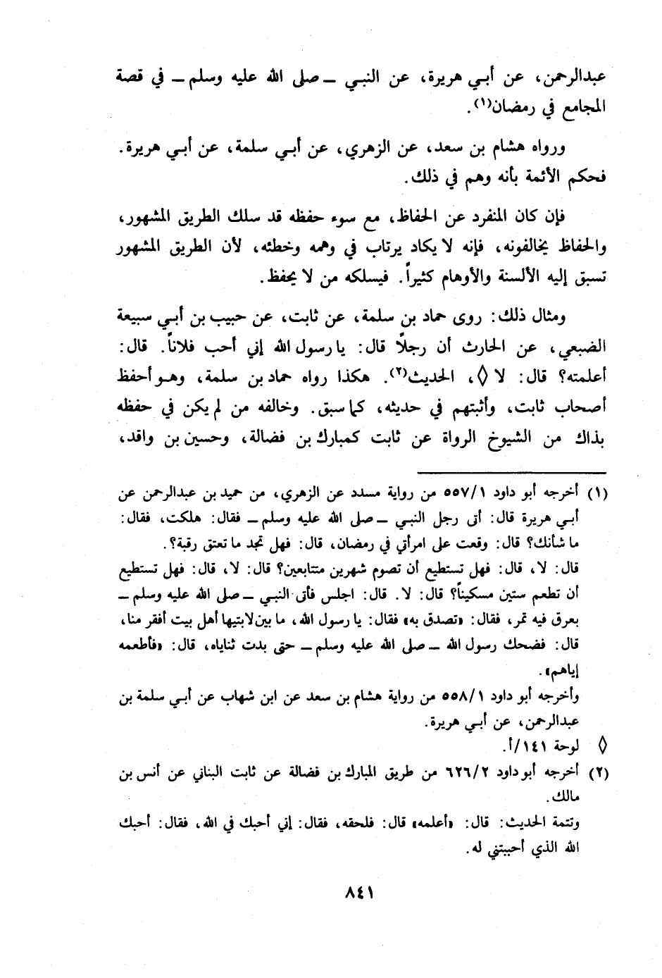 ومن ذلك أن حصين بن عبد الرحمن روى عن عمرو بن مرة، عن علقمة بن وائل، عن أبيه، عن النبي ـ A ـ حديث رفع اليدين في الصلاة، ورواه شعبة عن عمرو بن مرة عن أبي البختري، عن عبد الرحمن اليحصبي، عن وائل بن حجر، عن النبي ـ A ـ.
