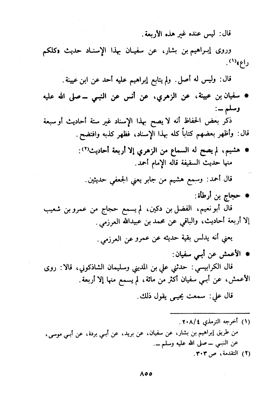 وقال البخاري، فيما حكاه عنه الترمذي في علله: لا أعرف لسفيان، يعني الثوري، عن حبيب بن أبي ثابت، ولا عن سلمة بن كهيل، ولا عن منصور، وذكر شيوخاً كثيرة، لا أعرف لسفيان عن هؤلاء تدليساً، ما أقل تدليسه.