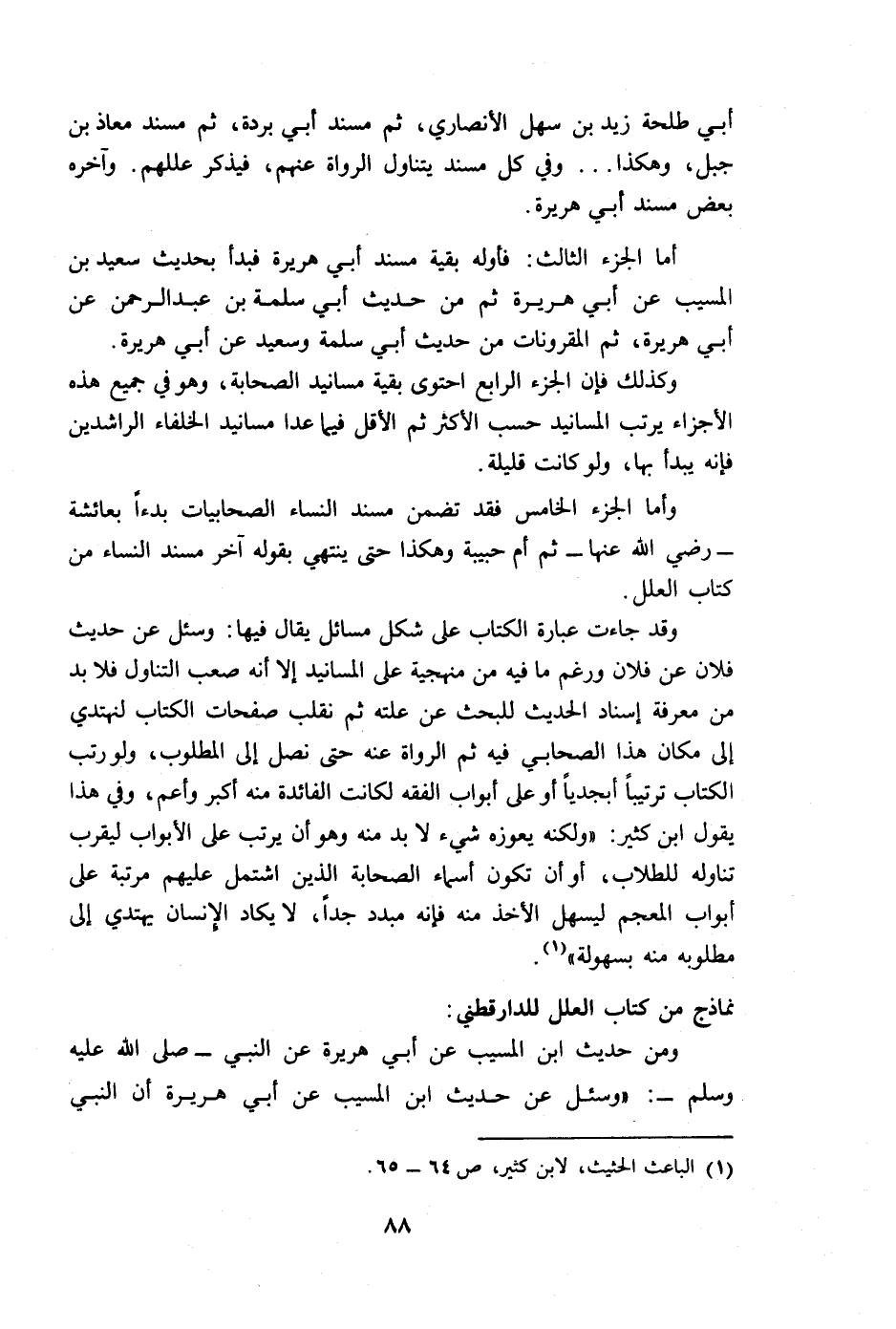 أبي طلحة زيد بن سهل الأنصاري، ثم مسند أبي بردة، ثم مسند معاذ بن جبل، وهكذا ... وفي كل مسند يتناول الرواة عنهم، فيذكر عللهم. وآخره بعض مسند أبي هريرة.