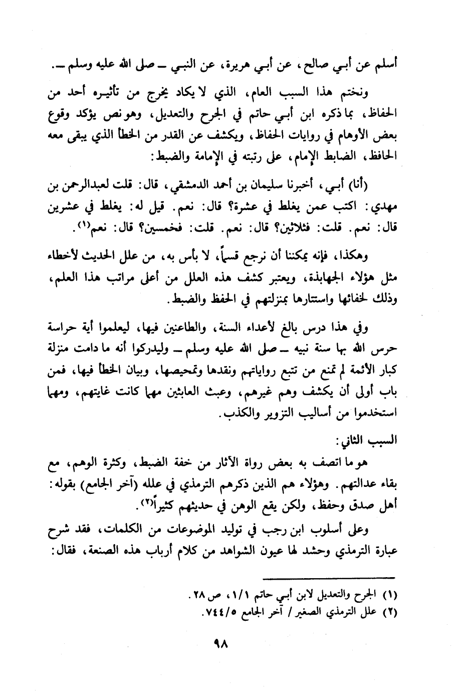 ونختم هذا السبب العام، الذي لا يكاد يخرج من تأثيره أحد من الحفاظ، بما ذكره ابن أبي حاتم في الجرح والتعديل، وهو نص يؤكد وقوع بعض الأوهام في روايات الحفاظ، ويكشف عن القدر من الخطأ الذي يبقى معه الحافظ، الضابط الإمام، على رتبته في الإمامة والضبط:
