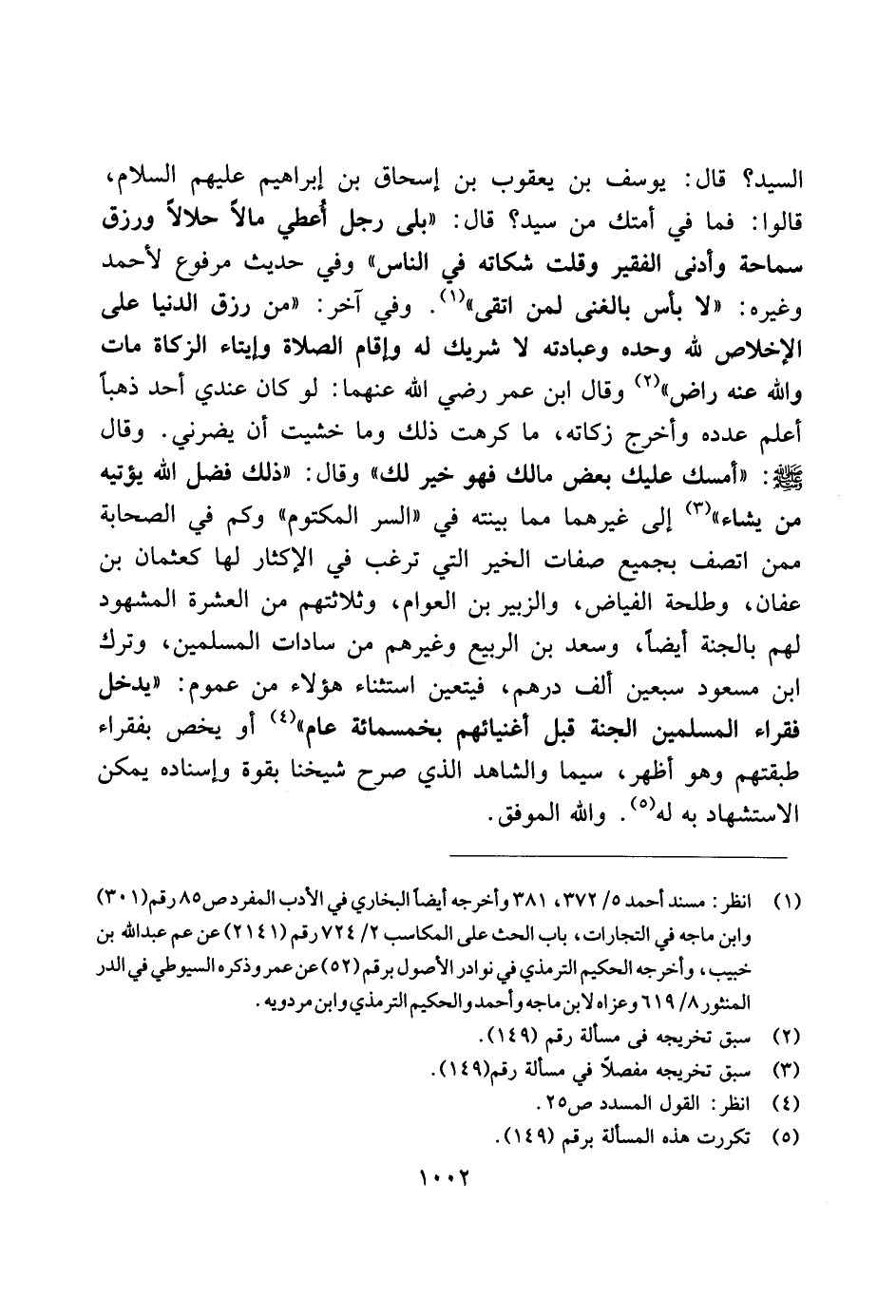 السيد؟ قال: يوسف بن يعقوب بن إسحاق بن إبراهيم عليهم السلام، قالوا: فما في أمتك من سيد؟ قال: "بلى رجل أعطي مالاً حلالاً ورزق سماحة وأدنى الفقير وقلت شكاته في الناس" وفي حديث مرفوع لأحمد وغيره: "لا بأس بالغني لمن اتقى". وفي آخر: "من رزق الدنياعلى الإخلاص لله وحده وعبادته لا شريك له وإقام الصلاة وإيتاء الزكاة مات والله عنه راض" وقال ابن عمر رضي الله عنهما: لو كان عندي أحد ذهبًا أعلم عدده وأخرجه زكاته، ما كرهت ذلك وما خشيت أن يضرني. وقال صلى الله عليه وسلم: "أمسك عليك بعض مالك فهو خير لك" وقال: "ذلك فضل الله يؤتيه من يشاء" إلى غيرهما مما بينته في "السر المكتوم" وكم في الصحابة ممن اتصف بجميع صفات الخير التي ترغب في الإكثار لها كعثمان بن عفان، وطلحة الفياض، والزبير بن العوام، وثلاثتهم من العشرة المشهود لهم بالجنة أيضًا، وسعد بن الربيع وغيرهم من سادات المسلمين، وترك ابن سمعود سبعين ألف درهم، فيتعين استثناء هؤلاء من عموم: "يدخل فقراء المسلمين الجنة قبل أغنيائهم بخمسمائة عام" أو يخص بفقراء طبقتهم وهو أظهر، سيما والشاهد الذي صرح شيخنا بقوة وإسناده يمكن الاستشهاد به له. والله الموفق.