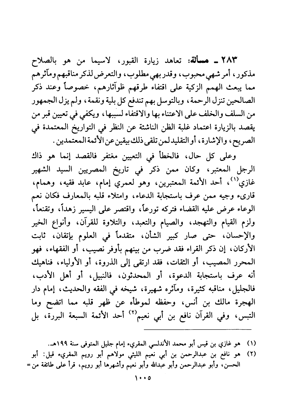 283 - مسألة: تعاهد زيارة القبور، لا سيما من هو بالصلاح مذكور، أمر شهي محبوب، وقدر بهي مطلوب، والترعض لذكر مناقبهم ومآثرهم مما يبعث الهمم الزكية على اقتفاء طرقهم ظآثارهم، خصوصًا وعند ذكر الصالحين تنزل الرحمة، وبالتوسل بهم تندفع كل بلية ونقمة، ولم يزل الجمهور من السلف والخلف على الاعتناء بها والاقتاء لسببها، ويكفي في تعيين قبر من يقصد بالزيارة اعتماد غلبة الظن الناشئة عن النظر في التواريخ المعتمدة في الصريح، والإشارة، أو التقليد لمن تلقى ذلك بيقين عن الأئمة المعتمدين.