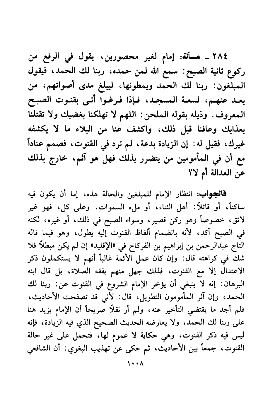 284 - مسألة: إمام لغير محصورين، يقول في الرفع من ركعو ثانية الصبح: سمع الله لمن حمده، ربنا لك الحمد، فيقول المبلغون: ربنا لك الحمد ويمطونها، ليبلغ مدى أصواتهم، من بعد عنهم، لسعة المسجد، فإذا فرغوا أتى بقنوت الصبح المعروف. وذيله بقوله الملحن: اللهم لا تهلكنا بغضبك ولا تقتلنا بعذابك وعافنا قبل ذلك، واكشف عنا من البلاء ما لا يكشفه غيرك، فقيل له: إن الزيادة بدعة، لم ترد في القنوت، فصمم عنادًا مع أن في المأمومين من يتضرر بذلك فهل هو آثم، خارج بذلك عن العدالة أم لا؟