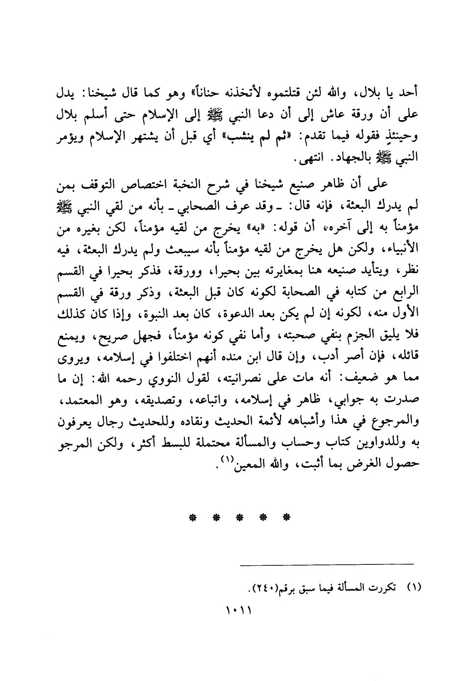 على أن ظاهر صنيع شيخنا في شرح النخبة اختصاص التوقف بمن لم يدرك البعثة، فإنه قال: ـ وقد عرف الصحابي ـ بأنه من لقي النبي صلى الله عليه وسلم مؤمنًا به إلى آخره" أن قوله: "به" يخرج من لقيه مؤمنًا، لكن بغيره من الأنبياء، ولكن هل يخرج من لقيه مؤمنًا بأنه سيبعث ولم يدرك البعثة، فيه نظر، ويتأيد صنيعه هنا بمغايرته بين بحيرا، وورقة، فذكر بحيرا في القسم الرابع من كتابه في الصحابة لكونه كان قبل البعثة، وذكر ورقة في القسم الأولمنه، لكونه إن لم يكن بعد الدعوة، كان بعد النبوة، وإذا كان كذلك فلا يليق الجزم بنفي صحبته، وأما نفي كونه مؤمنًا، فجهل صريح، ويمنع قائله، فإن أصر أدب، وإن قال ابن منده أنهم اختلفوا في إسلامه، ويروى مما هو ضعيف: أنه مات على نصرانيته، لقول النووي رحمه الله: إن ما صدرت به جوابي، ظاهر في إسلامه، واتباعه، وتصديقه، وهو المعتمد، والمرجوع في هذا وأشباهه لأئمة الحديث ونقاده وللحديث رجال يعرفون به وللدواوين كتاب وحساب والمسألة محتملة للبسط أكثر، ولكن المرجو حصول الغرض بما أثبت، والله المعين.