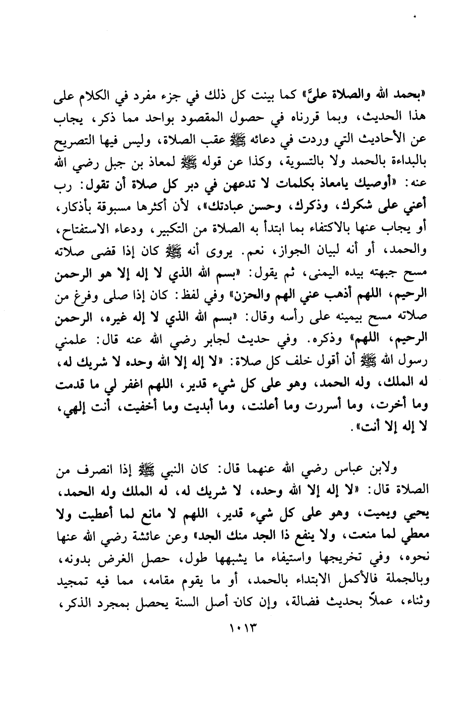 «بحمد الله والصلاة عليَّ» كما بينت كل ذلك في جزء مفرد في الكلام على هذا الحديث، وبما قررناه في حصول المقصود بواحد مما ذكر، يجاب عن الأحاديث التي وردت في دعائه صلى الله عليه وسلم عقب الصلاة، وليس فيها التصريح بالبداءة بالحمد ولا بالتسوية، وكذا عن قوله صلى الله عليه وسلم لمعاذ بن جبل رضي الله عنه: «أوصيك يا معاذ بكلمات لا تدعهن في دبر كل صلاة أن تقول: رب أعني على شكرك، وذكرك، وحسن عبادتك»، لأن أكثرها مسبوقة بأذكار، أو يجاب عنها بالاكتفاء بما ابتدأ به الصلاة من التكبير، ودعاء الاستفتاح، والحمد، أو أنه لبيان الجواز، نعم. يروى أنه صلى الله عليه وسلم كان إذا قضى صلاته مسح جبهته بيده اليمنى، ثم يقول: «بسم الله الذي لا إله إلا هو الرحمن الرحيم، اللهم أذهب عني الهم والحزن» وفي لفظ: كان إذا صلى وفرغ من صلاته مسح بيمينه على رأسه وقال: «بسم الله الذي لا إله غيره، الرحمن الرحيم، اللهم» وذكره. وفي حديث لجابر رضي الله عنه قال: علمني رسول الله صلى الله عليه وسلم أن أقول خلف كل صلاة: «لا إله إلا الله وحده لا شريك له، له الملك، وله الحمد، وهو على كل شيء قدير، اللهم اغفر لي ما قدمت وما أخرت، وما أسررت وما أعلنت، وما أبديت وما أخفيت، أنت إلهي، لا إله إلا أنت».