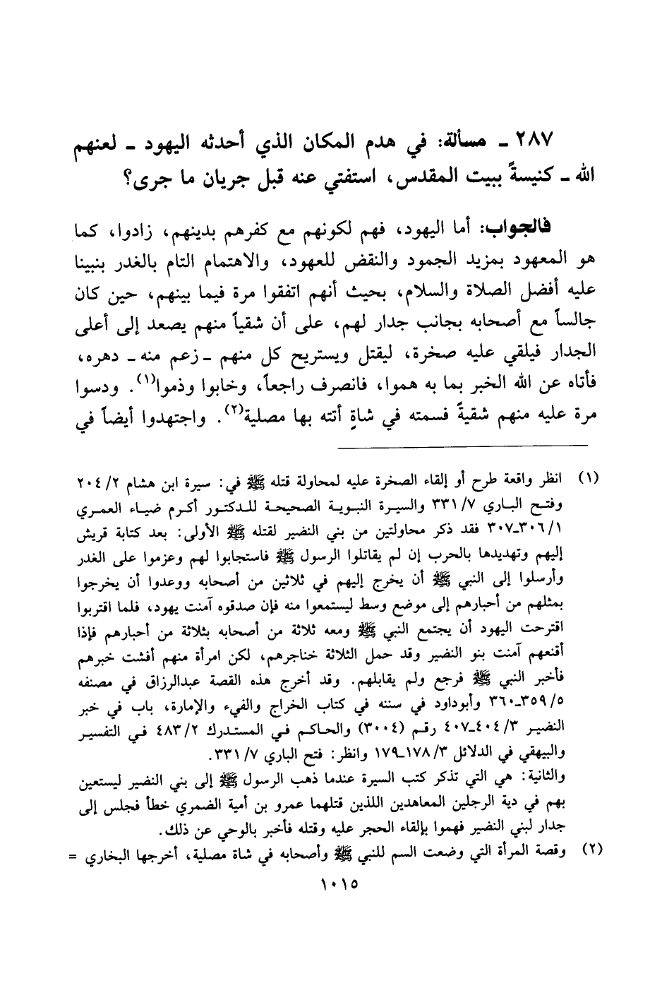 287 - مسألة: في هدم المكان الذي أحدثه اليهود ـ لنعهم الله ـ كنيسة ببيت المقدس، استفتي عنه قبل جريان ما جرى؟