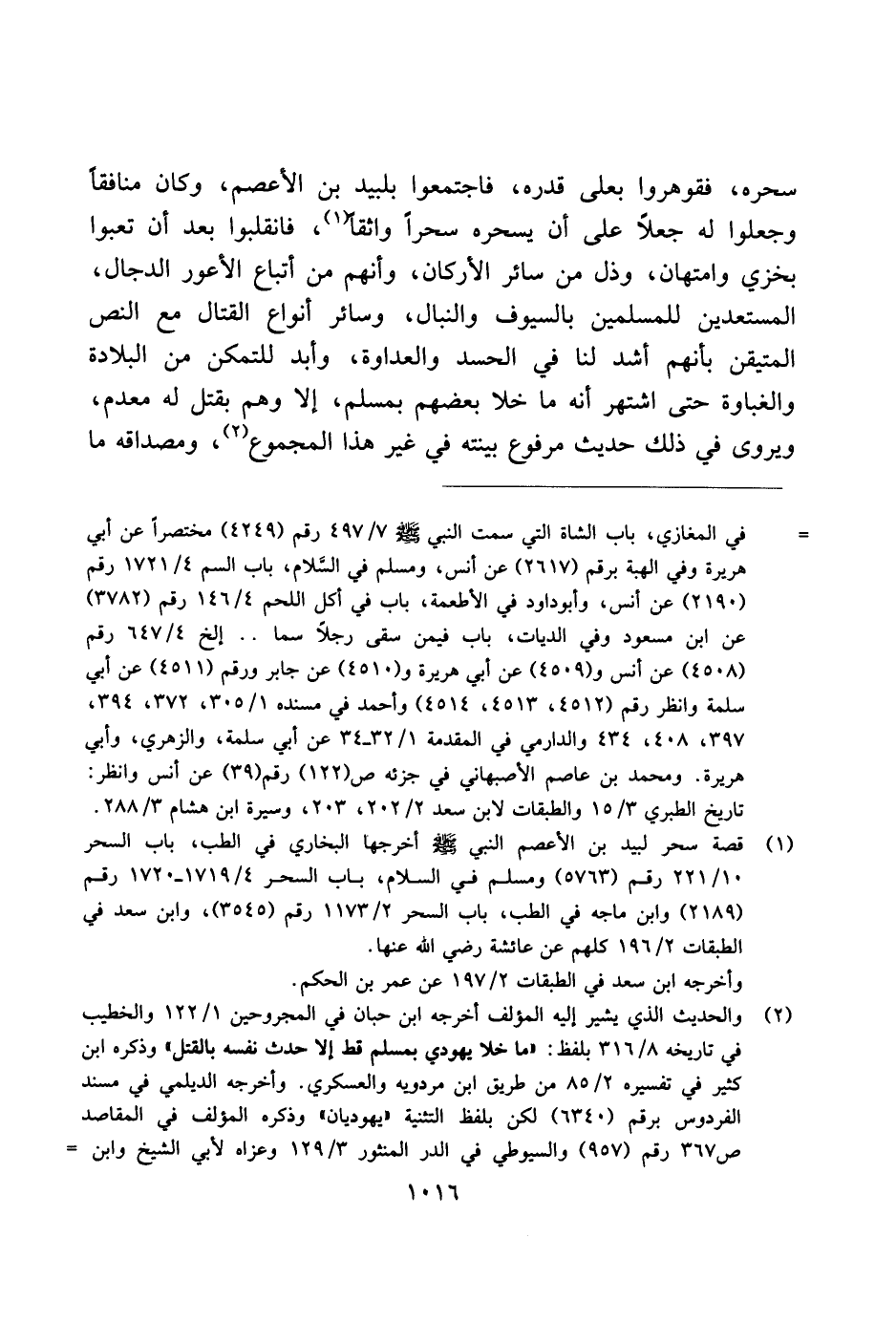 سحره، فقوهروا بعلى قدره، فاجتمعوا بلبيد بن الأعصم، وكان منافقًا وجعلوا له جعلاً على أن يسحره سحرًا واثقًا، فانقبوا بعد أن تبعوا بخزي وامتهان، وذلك من سائر الأركان، وأنهم من أتباع الأعور الدجال، المستعدين للمسلمين بالسيوف والنبال، وسائر أنواع القتال مع النص المتيقن بأنهم أشد لنا في الحسد والعداوة، وأبد للتمكن من البلادة والغباوة حتى اشتهر أنه ما خلا بعضهم بمسلم، إلا وهم بقتل له معدم، ويروى في ذلك حديث مرفوع بينته في غير هذا المجموع، ومصداقه ما