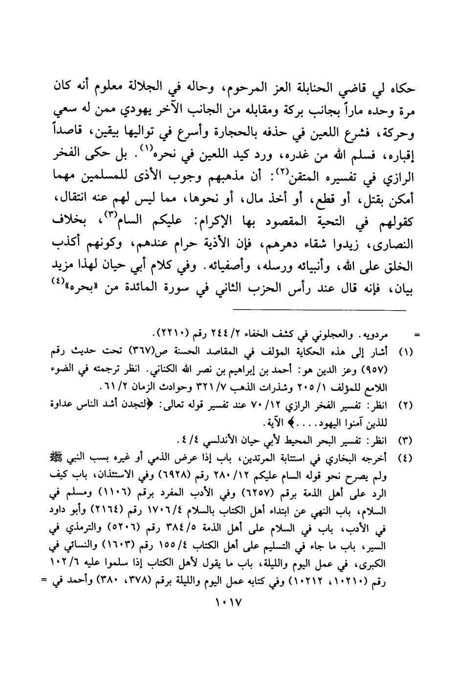 حكاه له قاضي الحنابلة العز المرحوم، وحاله في الجلالة معلوم أنه كانمرة وحده مارًا بجانب بركة ومقابله من الجانب الآخر يهودي ممن له سعي وحركة، فشرع اللعين في حذفه بالحجارة وأسرع في تواليها بيقين، قاصدًا إقباره، فسلم الله من غدره، ورد كيد اللعين في نحره. بل حكى الفخر الرازي في تفسيره المتقن: أن مذهبهم وجوب الأذى لمسلمين مهما أمكن بقتل، أو قطع، أو أخذ مال، أو نحوها، مما ليس لهم عنه انتقال، كقولهم في التحية المقصود بها الإكرام: عليكم السام، بخلاف النصارى، زيدوا شقاء دهرهم، فإن الأذية حرام عندهم، وكونهم أكذب الخلق على الله، وأنبيائه ورسله، وأصفيائه. وفي كلام أبي حيان لهذا مزيد بيان، فإنه قال عند رأس الحزب الثاني في سورة المائدة من "بحره"
