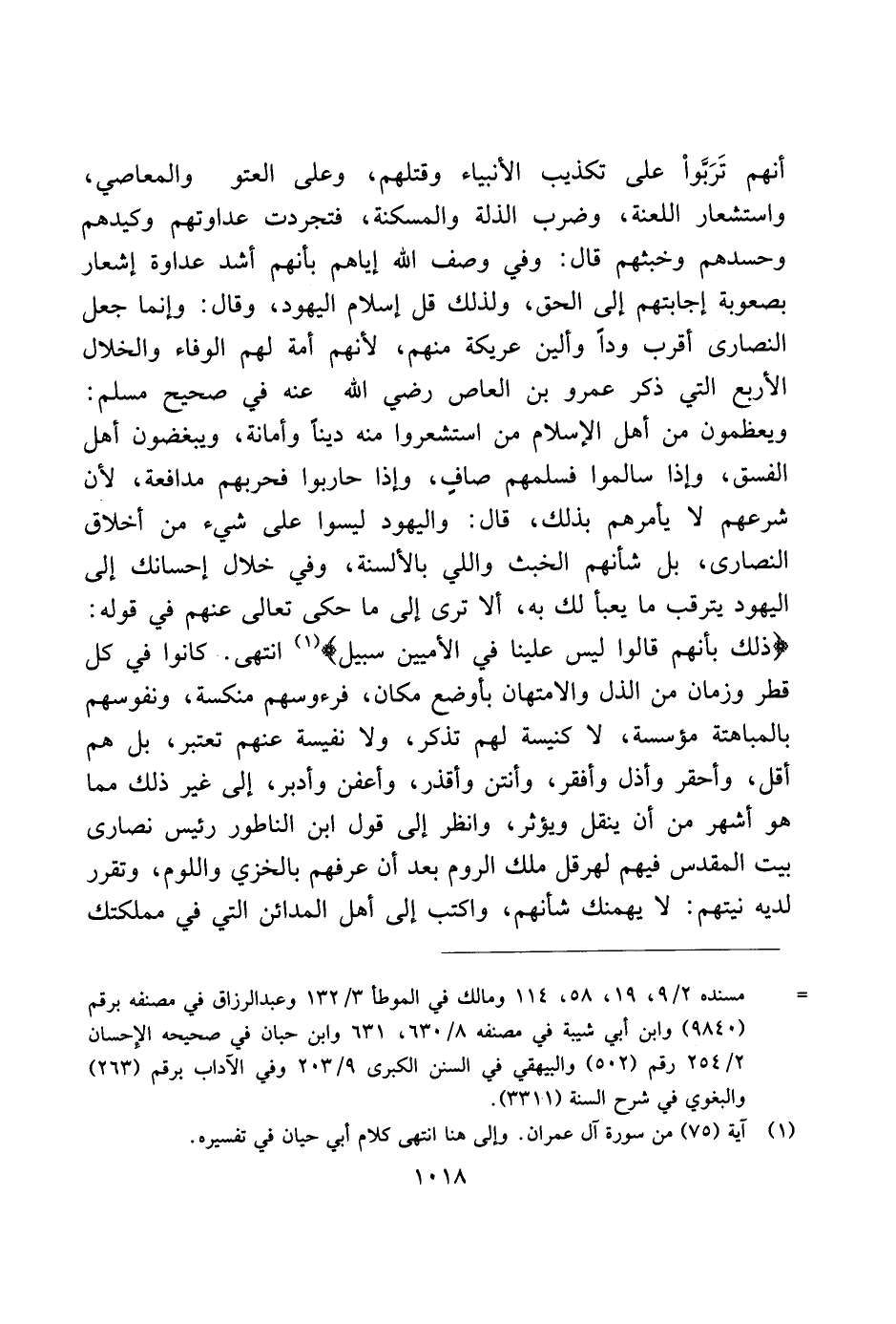 أنهم تربوا على تكذيب الأنبياء وقتلهم، وعلى العتو والمعاضي، واستشعار اللعنة، وضرب الذلة والمسكنة، فتجردت عداوتهم وكيدهم وحسدهم وخبثهم قال: وفي وصف الله إياهم بأنهم أشد عداوة إشعار بصعوبة إجابتهم إلى الحق، ولذلك قل إسلام اليهود، وقال: وإنما جعل النصارى أقرب ودًا وألين عريكة منهم، لأنهم أمة لهم الوفاء والخلال الأربع التي ذكر عمرو بن العاص رضي الله عنه في صحيح مسلم: ويعظمون من أهل الإسلام من استشعروا منه دينًا وأمانة، ويبغضون أهل الفسق، وإذا سالموا فسلمهم صافٍ، وإذا حاربوا فحربهم مدافعة، لأن شرعهم لا يأمرهم بذلك، قال: واليهود ليسوا على شيء من أخلاق النصارى، بل شأنهم الخبث واللي بالألسنة، وفي خلال إحسانك إلى اليهود يترقب ما يعبأ لك به، ألا ترى إلى ما حكى تعالى عنهم في قوله: (ذلك بأنهم قالوا ليس علينا في الأميين سبيل) انتهى. كانوا في كل قطر وزمان من الذل والامتهان بأوضع مكان، فرءوسهم منكسة، ونفوسهم بالمباهتة مؤسسة، لا كنيسة لهم تذكر، ولا نفيسة عنهم تعتبر، بل هم أقل، وأحقر وأذل وأفقر، وأنتن وأقذر، وأعفن وأدبر، إلى غير ذلك مما هو أشهر من أن ينقل ويؤثر، وانظر إلى قول ابن الناطور رئيس نصارى بيت المقدس فيهم لهرقل ملك الروم بعد أن عرفهم بالخزي واللوم، وتقرر لديه نبيتهم: لا يهمنك شأنهم، واكتب إلى أهل المدائن التي في مملكتك