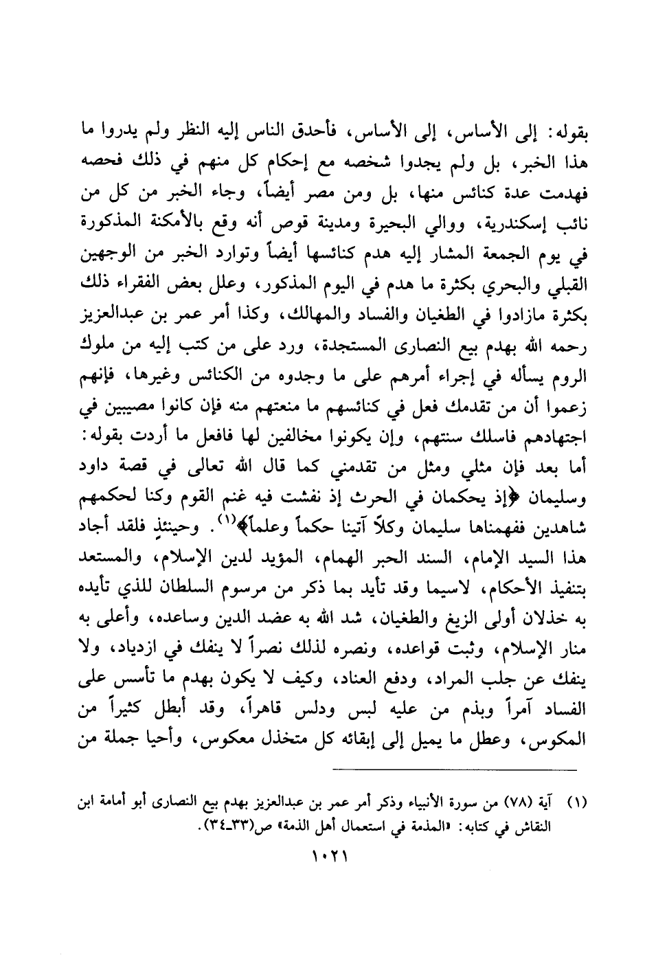 بقوله: إلى الأساس، إلى الأساس، فأحدق الناس إليه النظر ولم يدروا ما هذا الخبر، بل ولم يجدوا شخصه مع إحكام كل منهم في ذلك فحصه فهدمت عدة كنائس منها، بل ومن مصر أيضًا، وجاء الخبر من كل من نائب إسكندرية، ووالي البحيرة ومدينة قوص أنه وقع بالأمكنة المذكورة في يوم الجمعة المشار إليه هدم كنائسها أيضًا وتوارد الخبر من الوجهين القبلي والبحري بكثرة ما هدم في اليوم المذكور، وعلل بعض الفقراء ذلك بكثرة ما زادوا في الطغيان والفساد والمهالك، وكذا أمر عمر بن عبد العزيز رحمه الله بهدم بيع النصارى المستجدة، ورد على من كتب إليه من ملوك الروم يساله في إجراء أمرهم على ما وجدوه من الكنائس وغيرها، فإنهم زعموا أن من تقدمك فعل في كنائسهم ما منعتهم منه فإن كانوا مصيبين في اجتهادهم فاسلك سنتهم، وإن يكونوا مخالفين لها فافعل ما أدرت بقوله: أما بعد فإن مثلي ومثل من تقدمني كما قال الله تعالى في قصة داود وسليمان (إذ يحكمان في الحرث إذ نفشت فيه غنم القوم وكنا لحكمهم شاهدين ففهمناها سليمان وكلاً آتينا حكمًا وعلمًا). وحينئذٍ فلقد أجاد هذا السيد الإمام، السند الحبر الهمام، المؤيد لدين الإسلام، والمستعد بتنفيذ الأحكام، لا سيما وقد تأيد بما ذكر من مرسوم السلطان للذي تأيده به خذلان أولى الزيغ والطغيان، شد الله به عضد الدين وساعده، وأعلى به منار الإسلام، وثبت قواعده، ونصره لذلك نصرًا لا ينفك في ازدياد، ولا ينفك عن جلب المراد، ودفع العناد، وكيف لا يكون بهدم ما تأسيس على الفساد آمرًا وبذم من عليه لبس ودلس قاهرًا، وقد أبطل كثير من المكوس، وعطل ما يميل إلى إبقائه كل متخذل معكوس، وأحيا جملة من