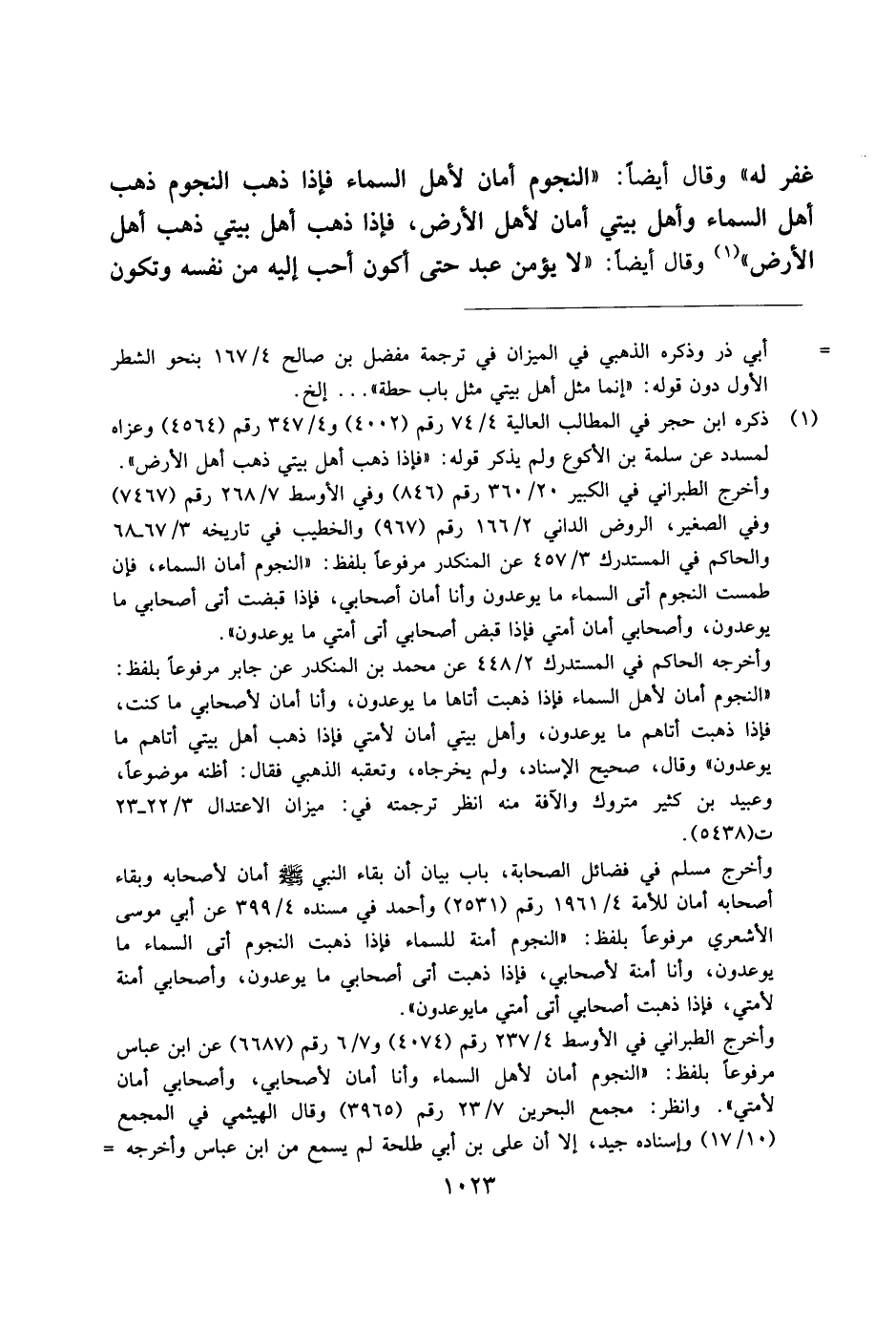 غفر له" وقال أيضًا: "النجوم أمان لأهل السماء فإذا ذهب النجوم ذهب أهل السماء وأهل بيتي أمان لأهل الأرض، فإذا ذهب أهل بيتي ذهب أهل الأرض" وقال أيضًا: "لا يؤمن عبد حتى أكون أحب إليه من نفسه وتكون