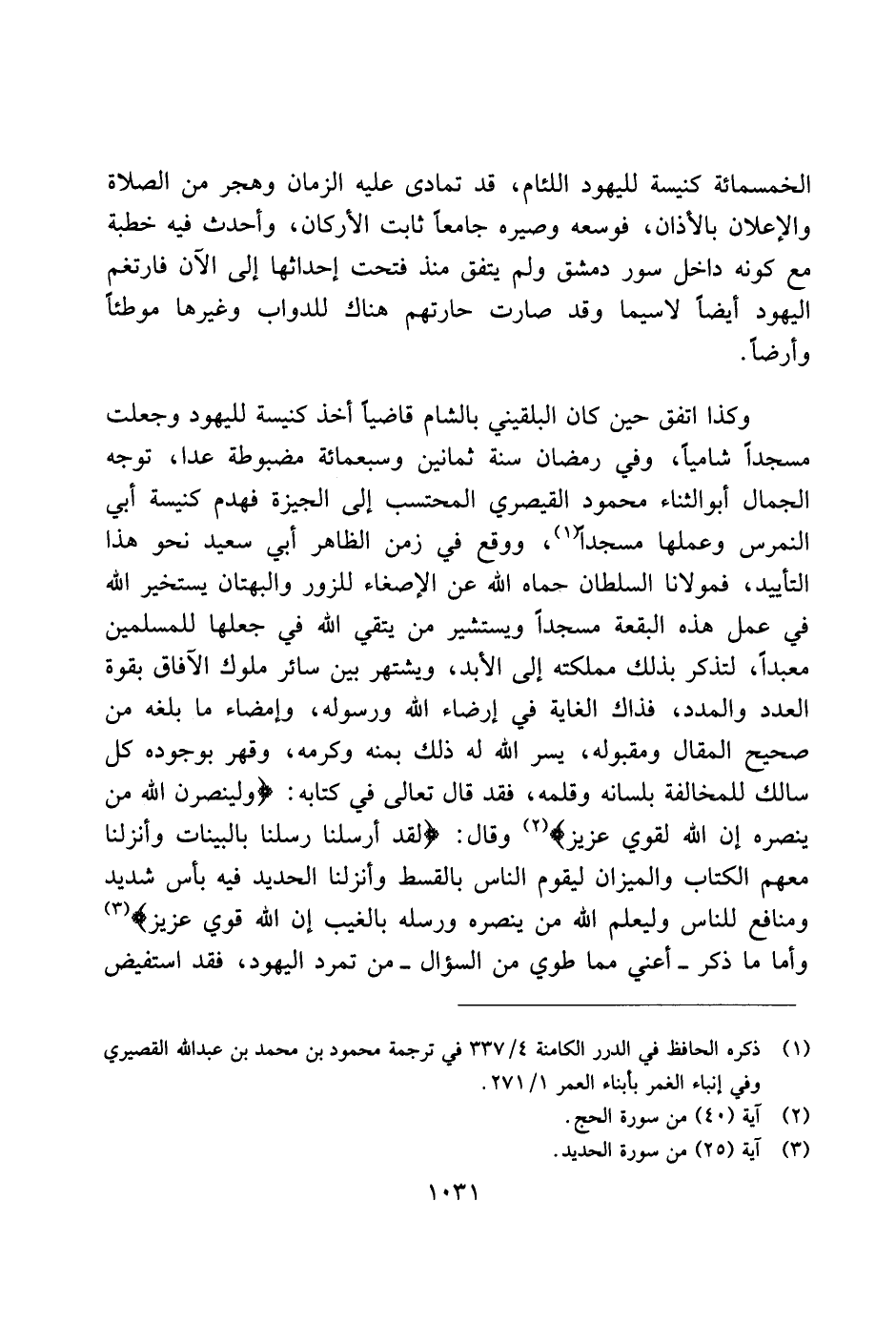 وكذا اتفق حين كان البلقيني بالشام قاضيًا أخذ كنيسة لليهود وجعلت مسجدًا شاميًا، وفي رمضان سنة ثمانين وسبعمائة مضبوطة عدا، توجه الجمال أبو الثناء محمود القيصري المحتسب إلى الجيزة فهدم كنيسة أبي النمرس وعملها مسجدًا، ووقع في زمن الظاهر أبي سعيد نحو هذا التأييد، فمولانا السلطان حماه الله عن الإصغاء للزور والبهتان يستخير الله في عمل هذه البقعة مسجدًا ويستشير من يتقي الله في جعلها للمسلمين معبدًا، لتذكر بذلك مملكته إلى الأبد، ويشتهر بين سائر ملوك الآفاق بقوة العدد والمدد، فذاك الغاية في إرضاء الله ورسوله، وإمضاء ما بلغه من صحيح المقال ومقبوله، يسر الله له ذلك بمنه وكرمه، وقهر بوجوده كل سالك للمخالفة بلسانه وقلمه، فقد قال تعالى في كتابه: (ولينصرن الله من ينصره إن الله لقوي عزيز) وقال: (لقد أرسلنا رسلنا بالبينات وأنزلنا معهم الكتاب والميزان ليقوم الناس بالقسط وأنزلنا الحديد فيه باس شديد ومنافع للناس وليعلم الله من ينصره ورسله بالغيب إن الله قوي عزيز)